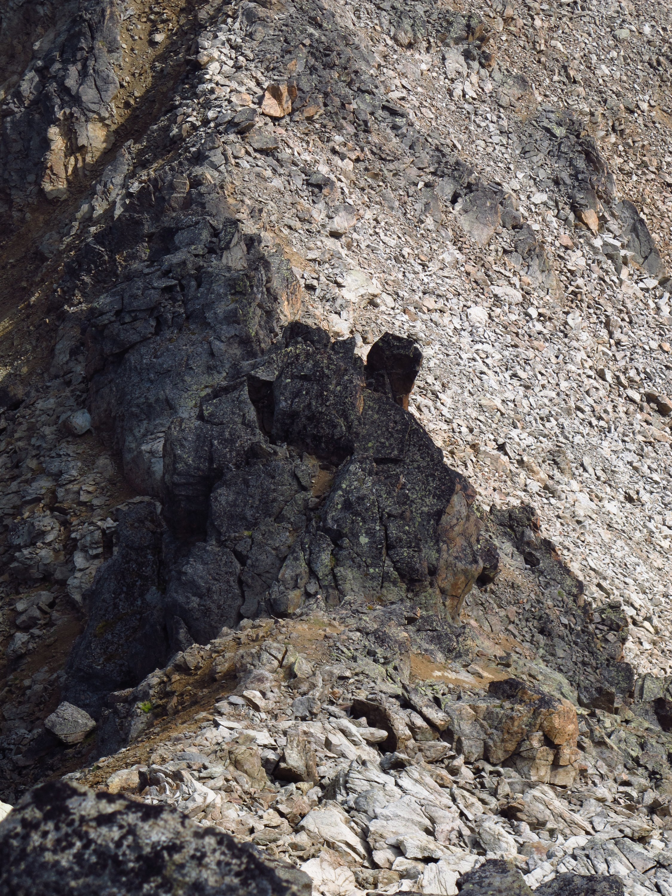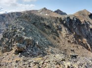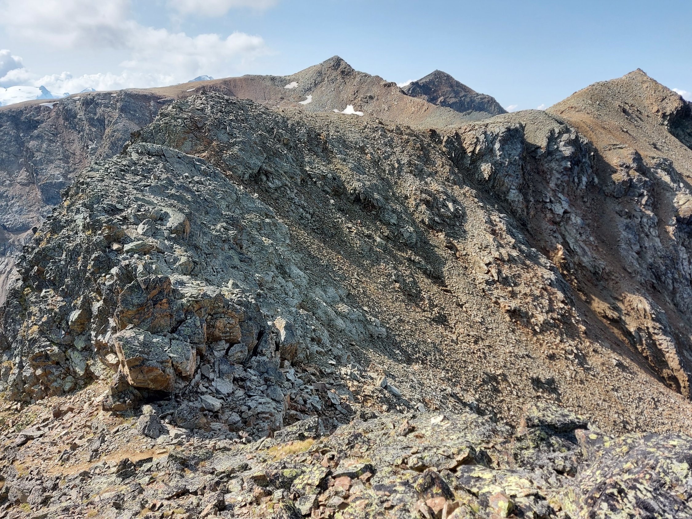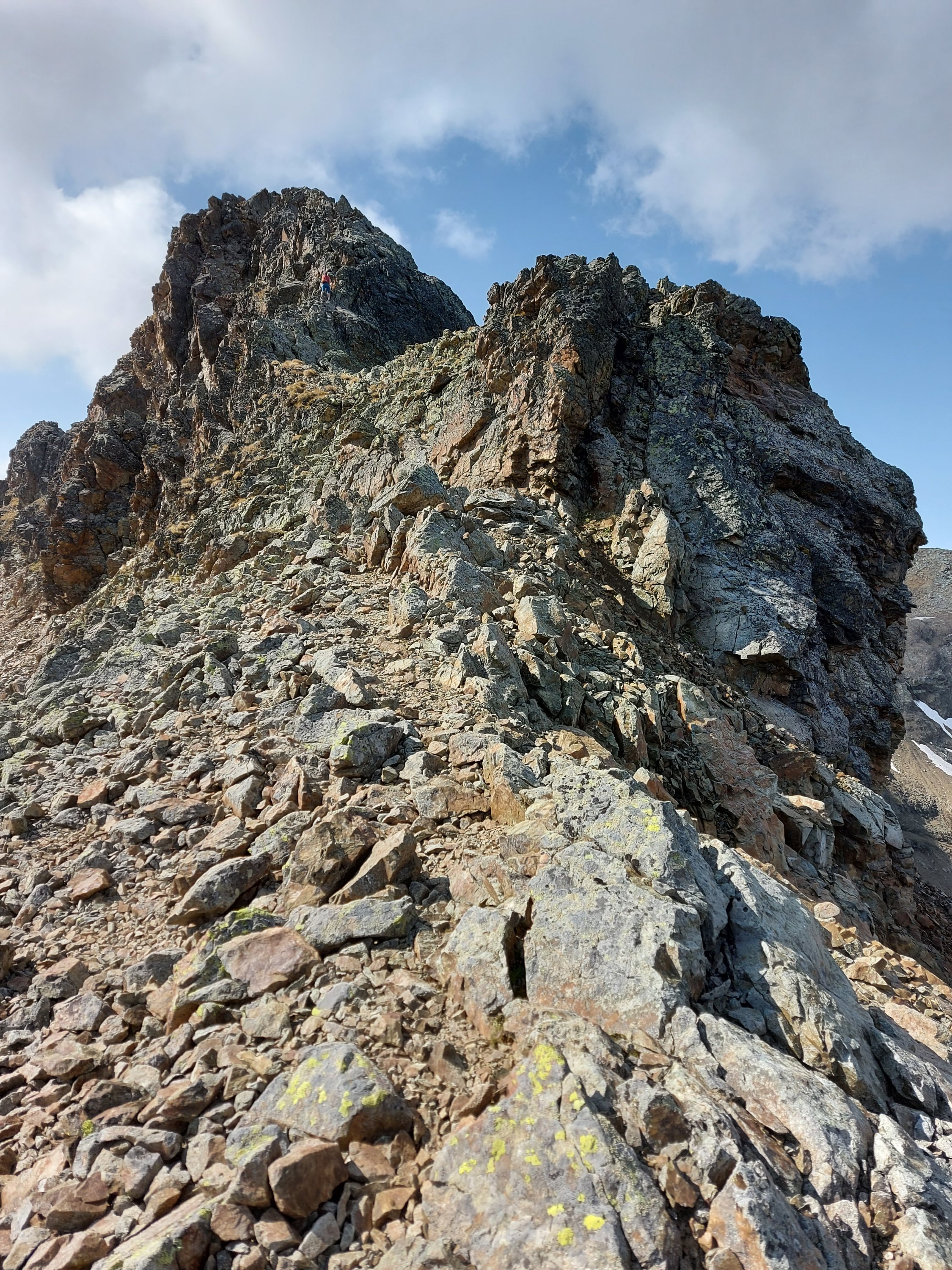 Die Routenfindung ist wegen einiger "Flankenspuren" nicht immer klar, Grundsatz: Auf Grat bleiben.