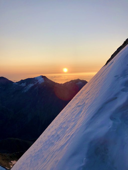 - auch beim Abstieg vom Nadelhorn um die Mittagszeit ist die Schneeauflage hart und griffig. Man kann auf dem Hohbalmgletscher bis zur Hütte überqueren!