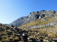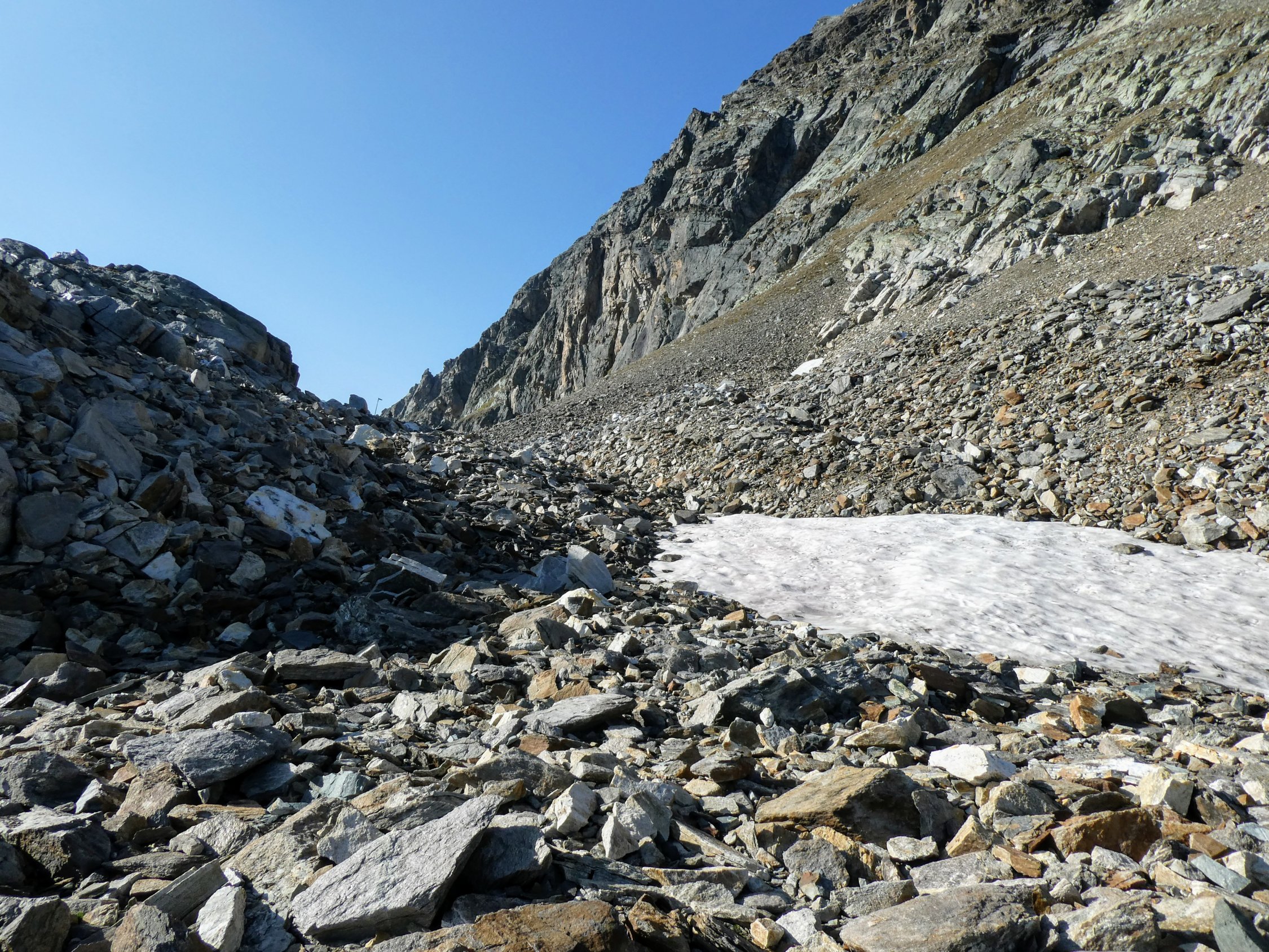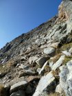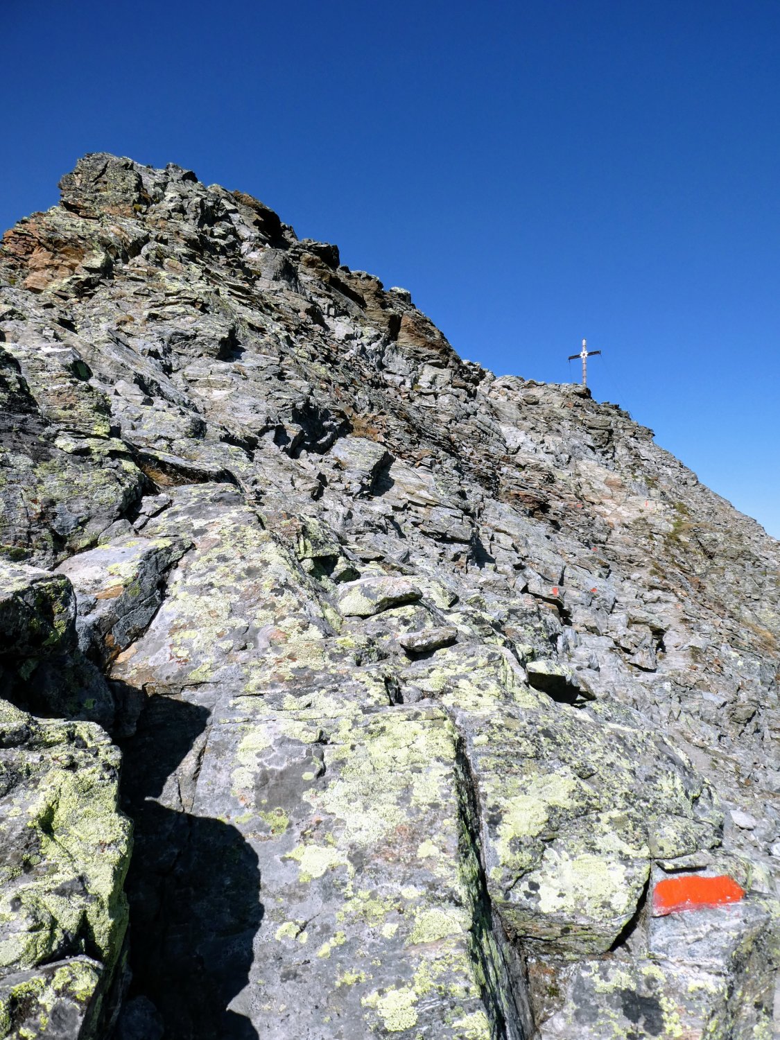 Der Schlussaufstieg von der Radschulter zum Gipfel ist nicht offiziell markiert, aber viele rote, inoffizielle Striche leiten bestens durch die steile Flanke.