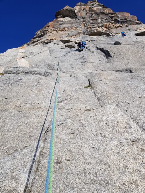 Wir haben nochmals das schöne Herbstwetter genutzt um diese Traumroute zu klettern. Die Klettersaison auf dieser Höhe (Gipfel 2882 müM) neigt sich dem Ende zu mit dem angekündigten Wintereinbruch. Wir sind vom Furkablick los, alles dem Hüttenweg zur Sidelenhütte folgend bis zum kleinen Seelein gerade unter der Hütte . Von dort nach links Richtung Hannibalturm den Steinmandli folgend über das Geröllfeld und Gletscher zum Einstieg der Conquest. Einstieg 9:15. Vor uns drei 2er Seilschaften die aber nicht gestört haben, waren sie doch ziemlich zügig unterwegs. 1 SL: es geht gerade los mit 2 bis 3 klein-griffigen/trittigen Stellen dann rechts zum Stand. 2 SL: tolle Felsformationen mit Quarzband and kleinem Dach zum Stand. 3 SL: leicht links haltend bis zu einem Band, dort um die Ecke in eine Verschneidung und gerade hoch dann am Schluss nicht gerade zum gut sichtbaren Stand sondern links um die Ecke zum Stand der Conquest (gerade hoch wäre dann ein 6b+ Riss). 4 SL. zuerst leicht links haltend dann mehr oder weniger gerade hoch zum Stand, herrliche Kletterei. 5 SL: Schlüsselstelle. leicht links haltend aufs Band zum Haken. Und dann geht es los zwar gut gesichert aber schwierig und exponiert, macht aber trotzdem Spass. Ich musste 2 mal PAen. Peter hat es im Nachstieg frei geschafft. 6 SL: ein wenig einfacher aber in immer noch schöner Kletterei zum Gipfel, mit der schönsten Bushaltestelle der Schweiz :-), Es war genug warm dass wir es auch richtig geniessen konnten auf dem Gipfel. Dann zuerst nach Osten über die Abseilpiste zum Einstieg (50 m Doppelseil erforderlich). 2. Abseilstelle ist Spektakulär. Ein unvergesslicher Tag! Die Mitstreiter am Berg werden immer jünger ;-)