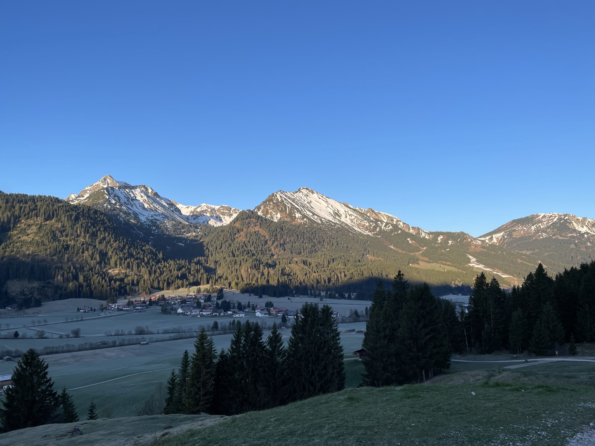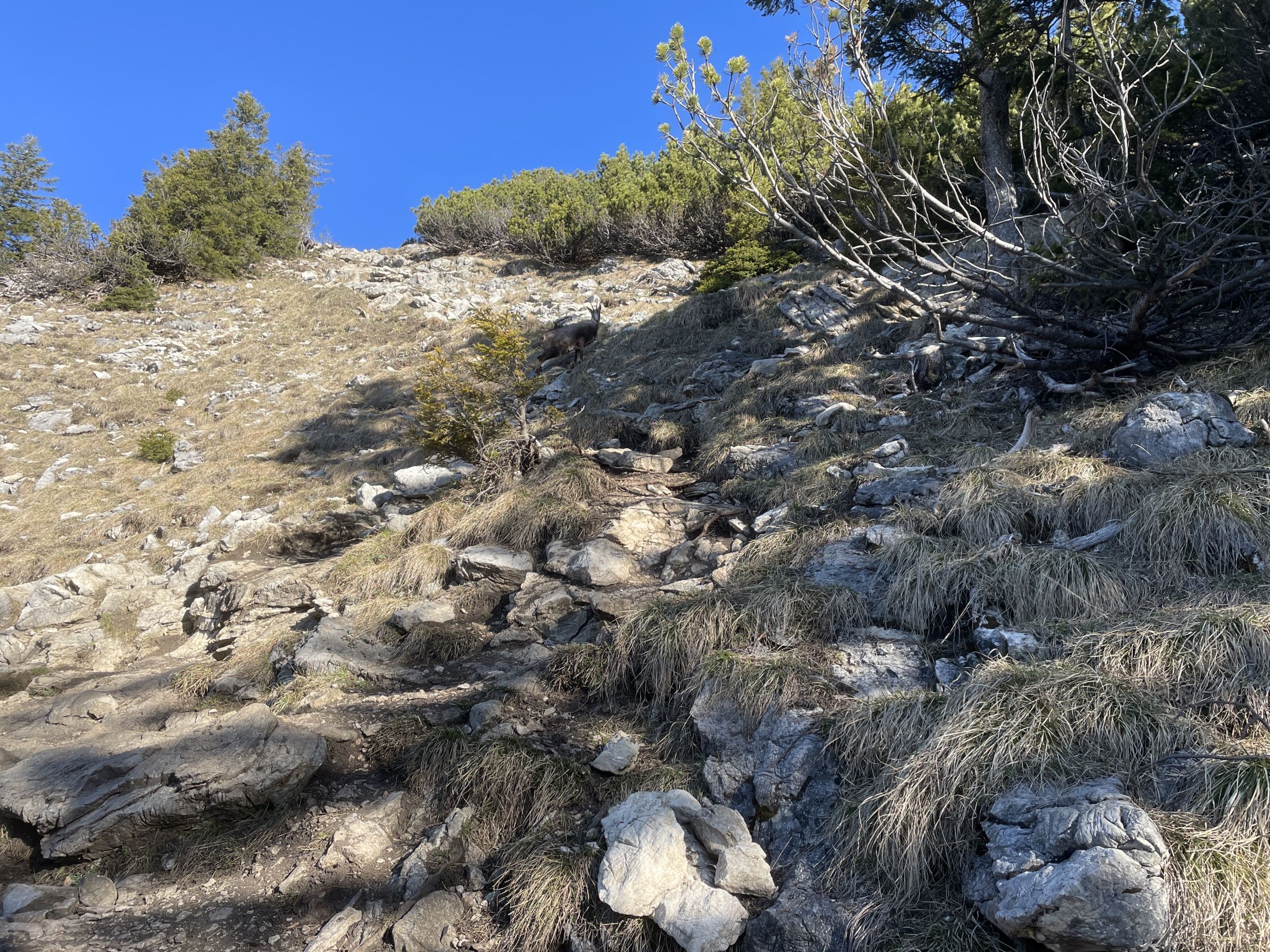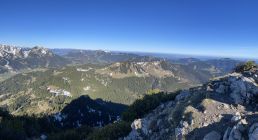 Tourenbeginn um 06:30°C bei -2°C unter wolkenlosem Himmel. Mit der Sonne kam dann auch die Wärme. Oberer Ostgrat und die Südseite ist komplett schneefrei. Die Nordseite ist dagegen noch schneebedeckt. Der diagonal verlaufende Wanderweg aus dem Achtal zum Sattel im Ostgrat ist noch gut eingeschneit.