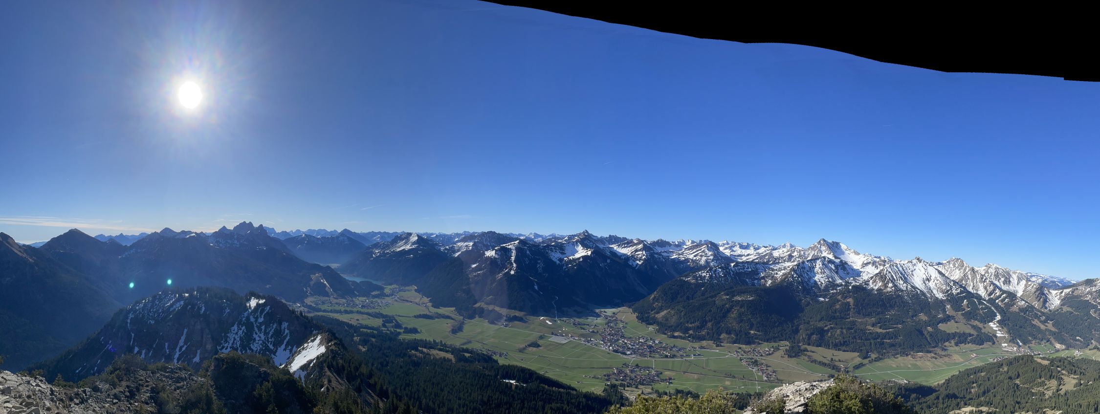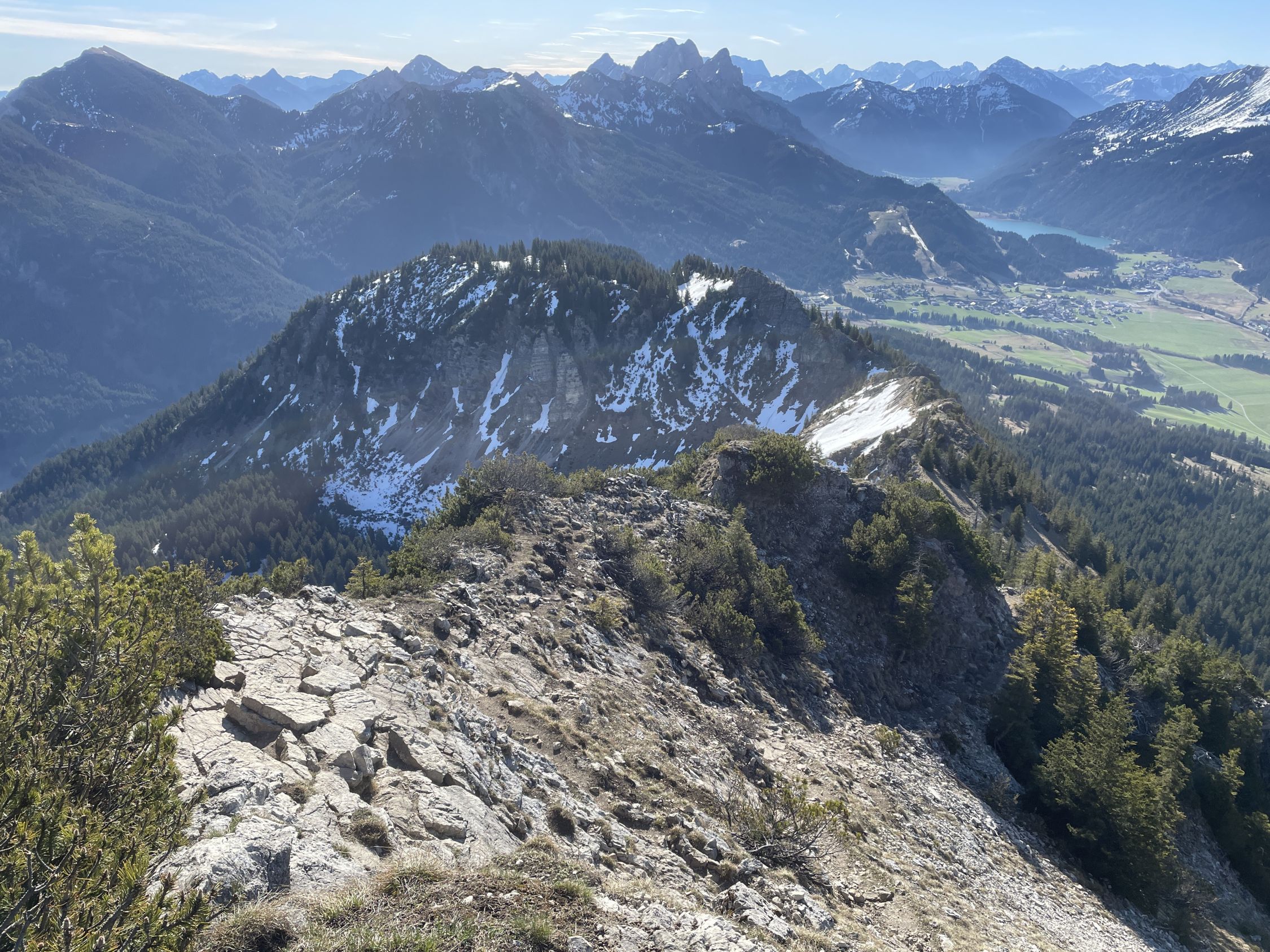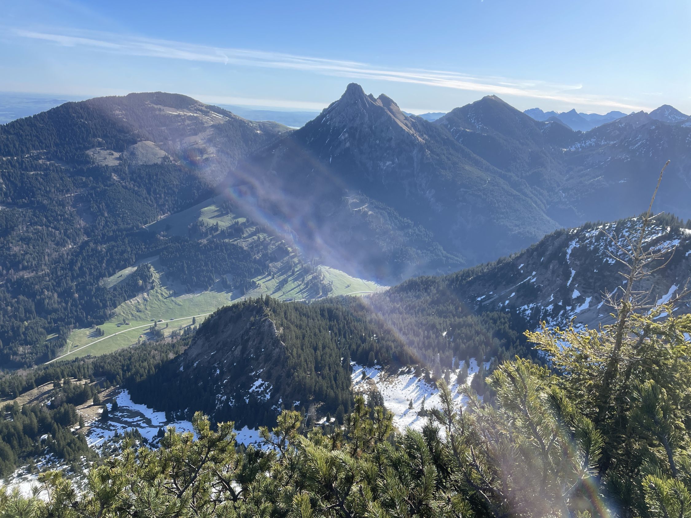 Vom Gipfel hat man Rundumsicht zu den Tannheimer Bergen (Läuferspitze, Rote Flüh, Gimpel, Köllenspitze) im Osten, die Pyramide vom Aggenstein und zum Breitenberg im Norden. Hinter dem Haldensee im Tal erkennt man den Thaneller. Im Süden präsentiert sich die Lailachspitze, im Südwesten der Hochvogel. Wegen seiner Panorama-Lage und der schneefreien Südseite, wird die kurze Route wohl zur Zeit gut frequentiert werden.