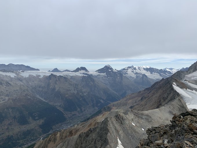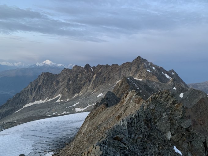 Start 5:30 Bietschhornhütte hat perfekt gepasst - am Morgen noch ein paar Sonnenstrahlen, 9:15 am Wilerhorn mit noch guter Aussicht nach Osten. Im Westen Gipfel > 4000 m bereits in Wolken. Bis am frühen Nachmittag ohne Niederschlag.
