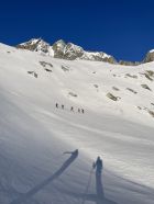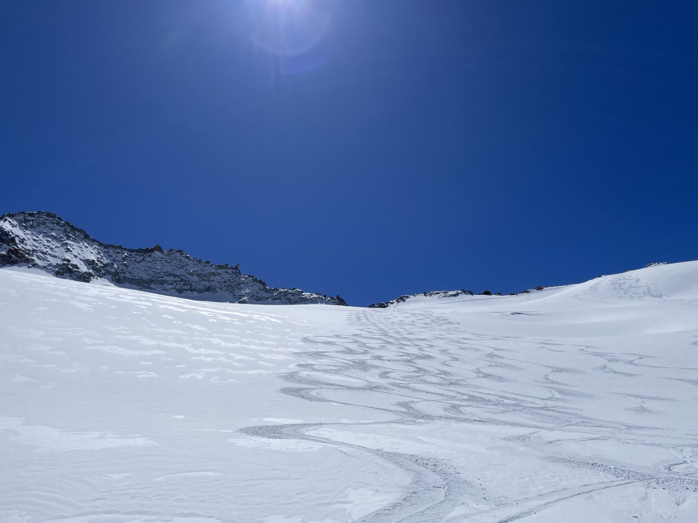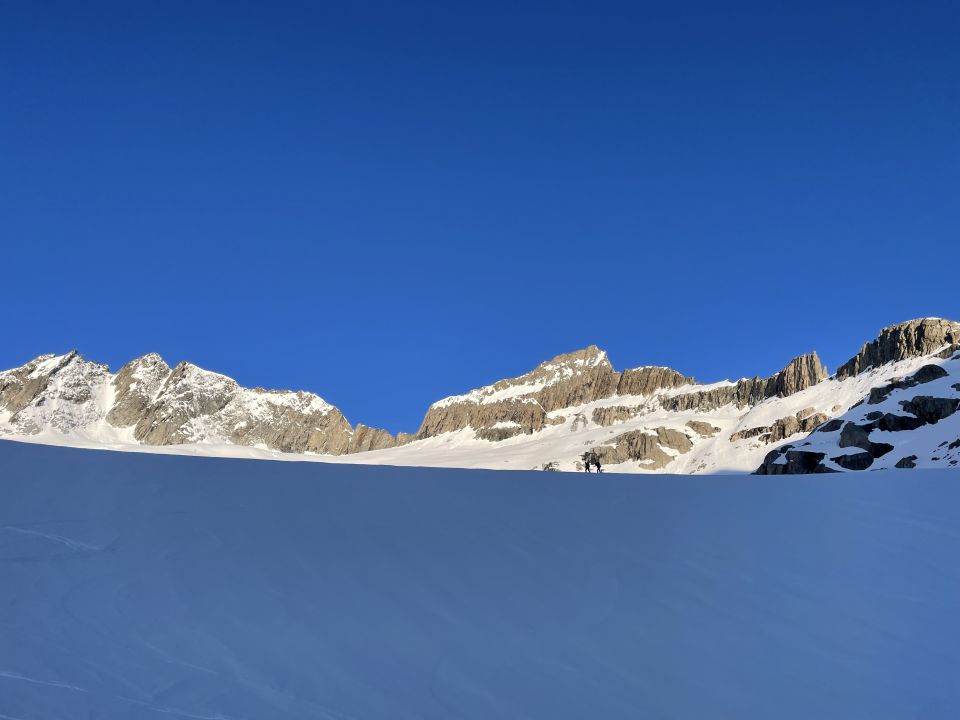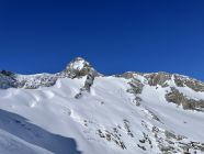 Start um 06:00 in der Bächlitalhütte, durchgehend Schnee bei der kurzen Abfahrt in den Boden des Bächlitals. Aufstieg zur oberen Bächlilücke bei gut eingeschneitem Gletscher. Steilste Stelle mit Harscheisen. An der Lücke Schnee bis zu den Leitern reichend; kleiner Schrund. Abstieg auf der Nordseite mit Steigeisen; kurze Seilsicherung für erste 10m ab Lücke, danach stets Ketten freiliegend greifbar. Abfahrt in Hartschnee und Traverse westwärts; hierbei einzelne glasig blanke Gletscherstellen umfahrbar. Aufstieg zum kleinen Joch nördlich des Hienderstockes in Pulverschicht vom Vortag. Letzte 20Hm zu Fuss in Trittspuren. Mittels Ski Traverse und Aufstieg zum Zmittag auf dem Hubelhorn. Abfahrt direttissima zum Gaulisee (von oben etwas bedrohlich hellblau schimmernd; tragend und von vielen Personen begangen). Ab See Aufstieg-Abfahrt-Aufstieg zur Gaulihütte in ausgesperten Verhältnissen; nur 1 Tragestelle am Dienstag.