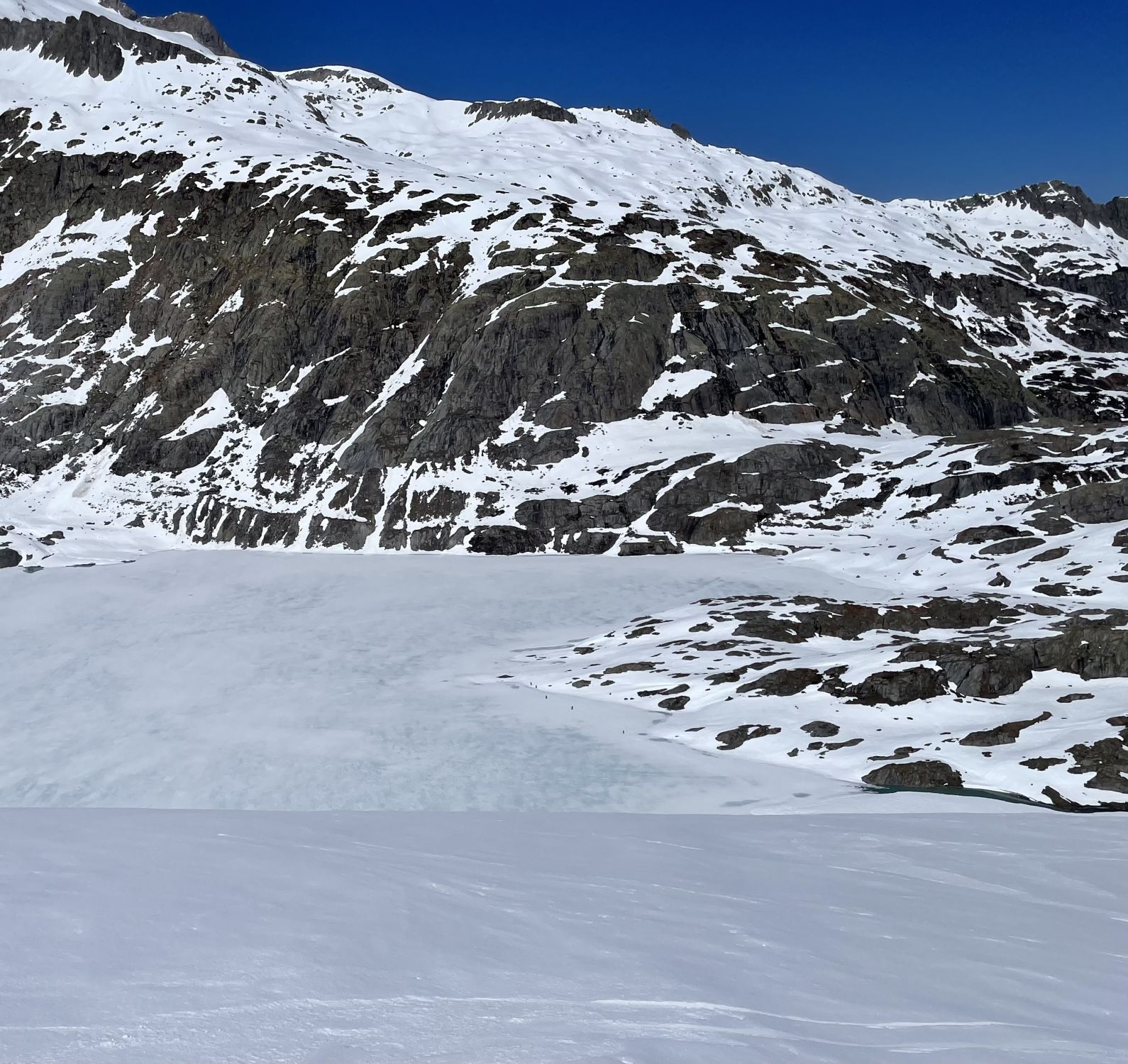 Belastbarkeit des Gaulisees und Ausaperung/ Nasschnee unterhalb der Gaulihütte werden bald die Herausforderungen sein