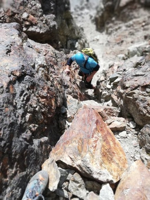 Sehr viel loses Gestein findet man hier. Immer achtsam sein wohin man greift und tritt.
