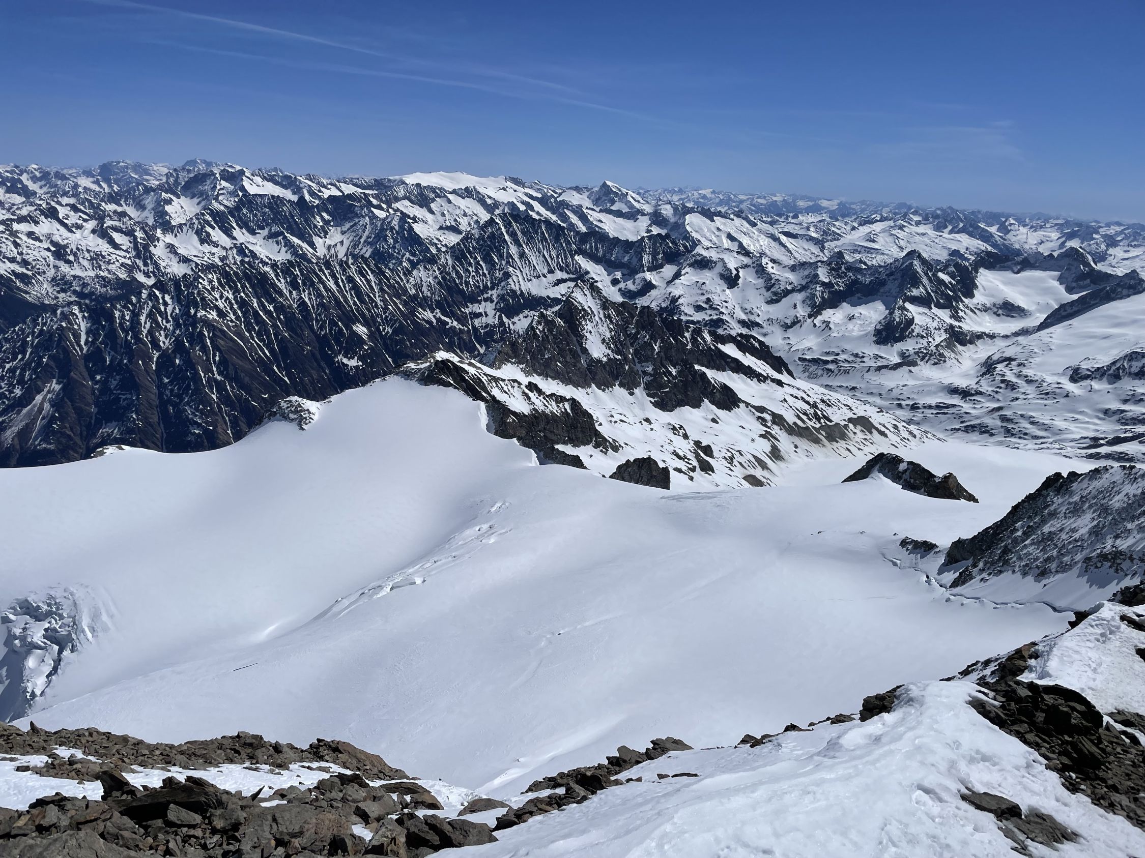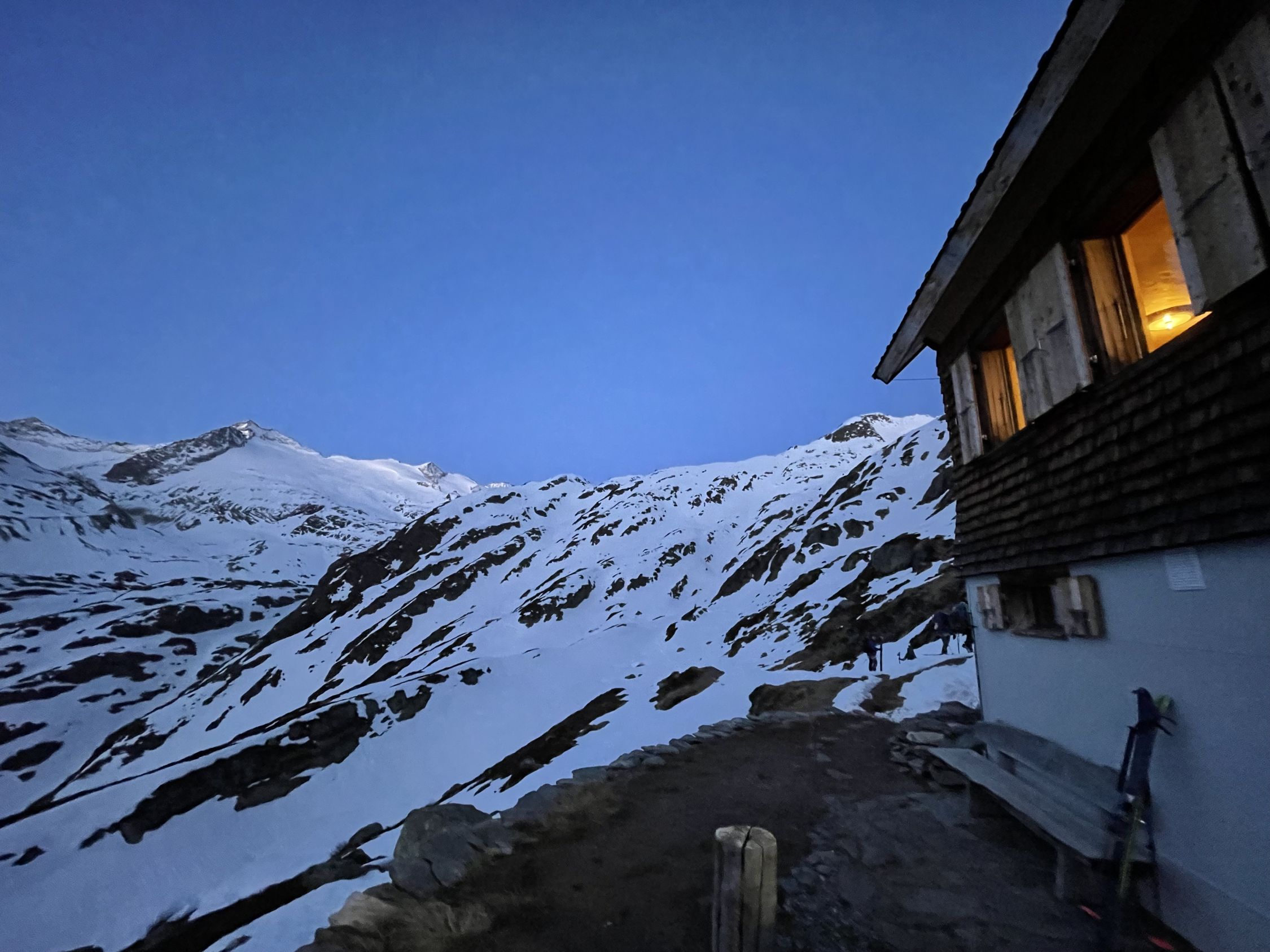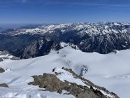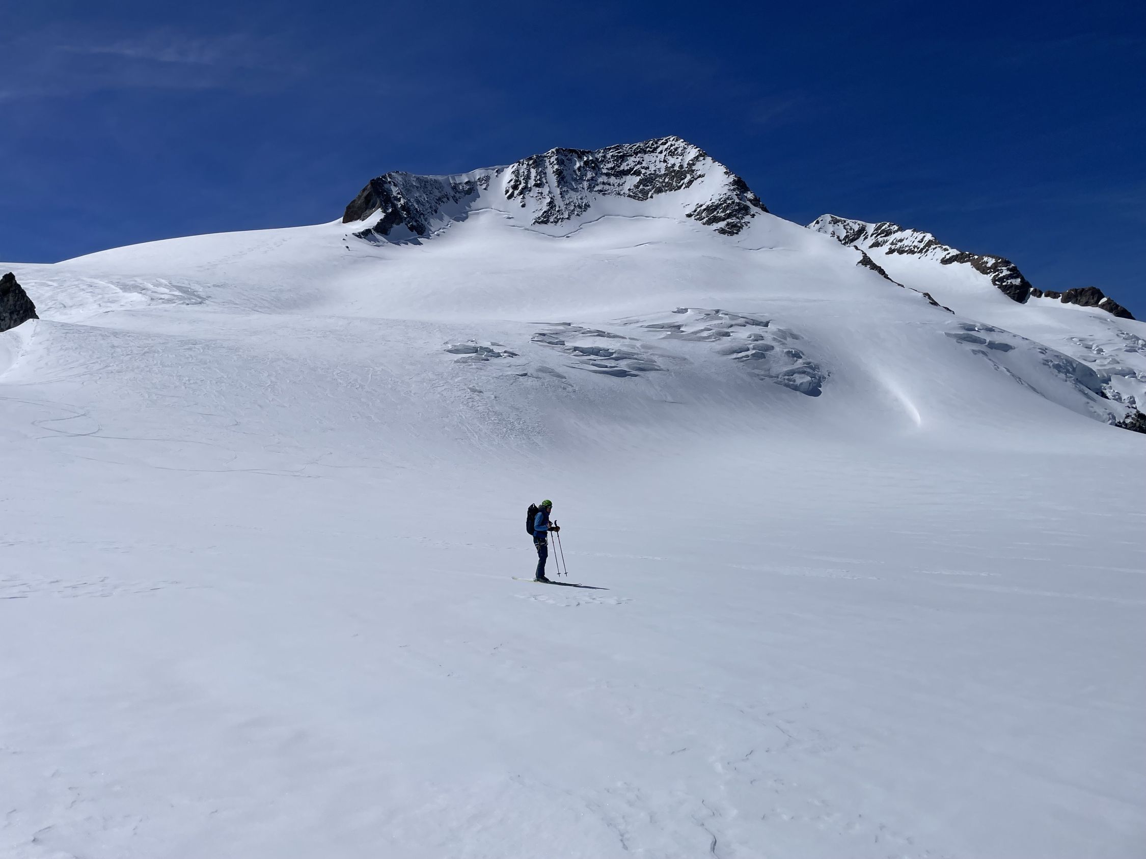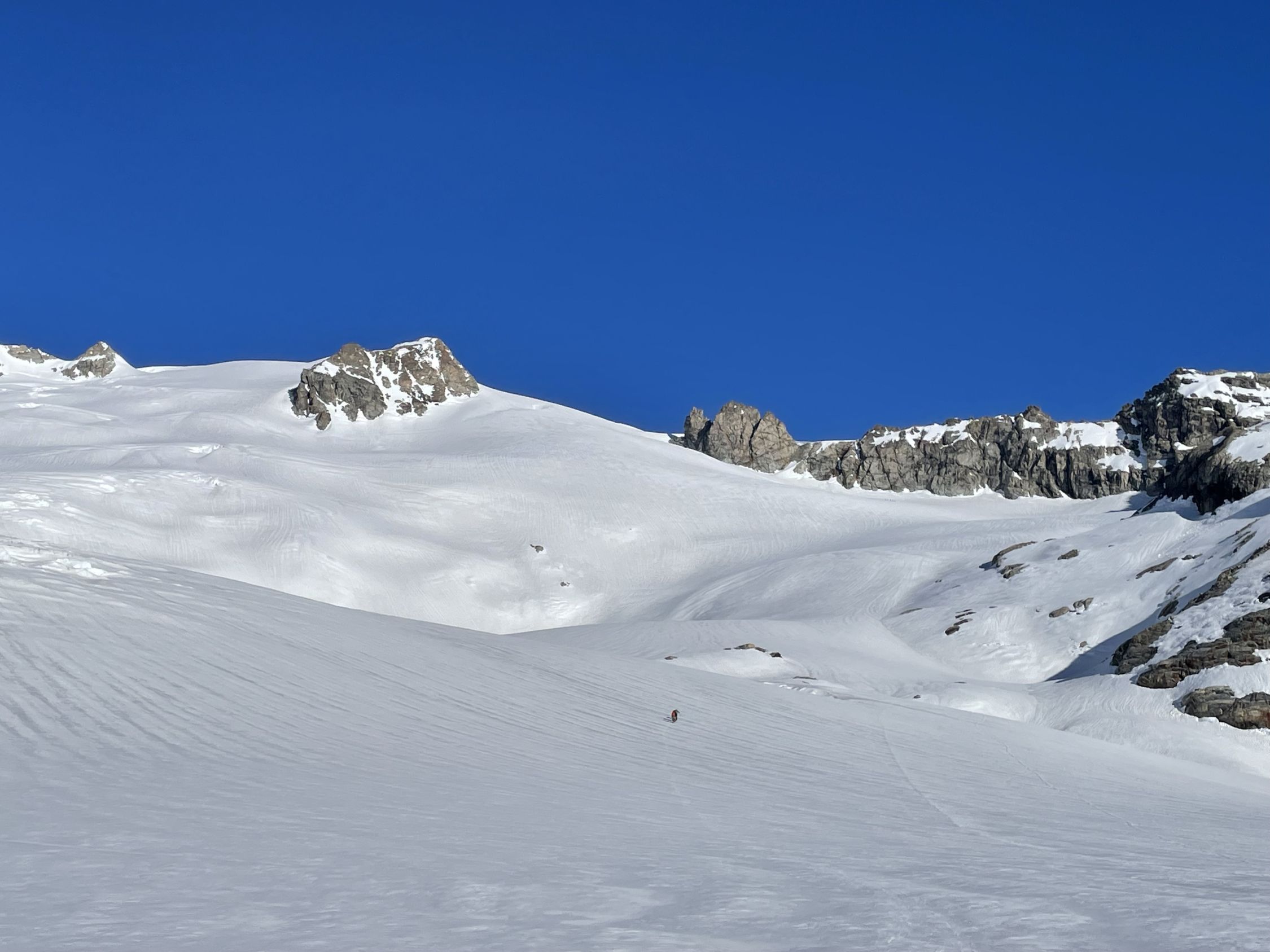 Ab Gaulihütte via prominente Kurz-Zick-Zack-Skispur auf die Chammliegg auf harten Verhältnissen, keine blanken Stellen. Am Dakota-Propeller vorbei traversierend nach Westen auf den Gletscher. Höhe nur mässig gut verwaltbar, da Seitenmoräne ausapernd. 1 Tragestelle von 3m. Unproblematisch zur westl. Wätterlimi. Wetterlimiplateau mit 1 grösseren Spalte (nicht offen, aber etwas gesetzt mit Presspulver tragend stabil gedeckt), desh dort angeseilt bis Skidepot am Rosenhorn. Bissige Bise. Südflanke gefroren, zt glasige Stellen. Daher Skidepot bereits am Fuss der Südflanke. Aufstieg bis Gipfel mit Steigeisen/ Pickel. Im Nachhinein Skiaufstieg Südflanke mit Harscheisen machbar. Abfahrt ab Wetterlimi in Abfahrtsrichtung rechts entlang Felsbegrenzun des Tossen unproblematisch bis Rosenlauibiwak (Presspulver, ok zu fahren, zt Hartschnee etwas knusprig). Ab Rosenlauibiwak ausgeapert, Lawinenschnee (Passage von mind 2 grossen Schnee/Geröllrutschen. Problematisch das Couli unterh Rosenl. Biwak mit Fischmaul. Schnee dort um 14 Uhr noch gefroren, kurze 10m Passage übers Fischmaul, wieder an die rechte Felsseite. Ab da Lawinenschnee. Fahrbar bis Beginn Wald; Gehzeit 45min bis Gletscherschlucht