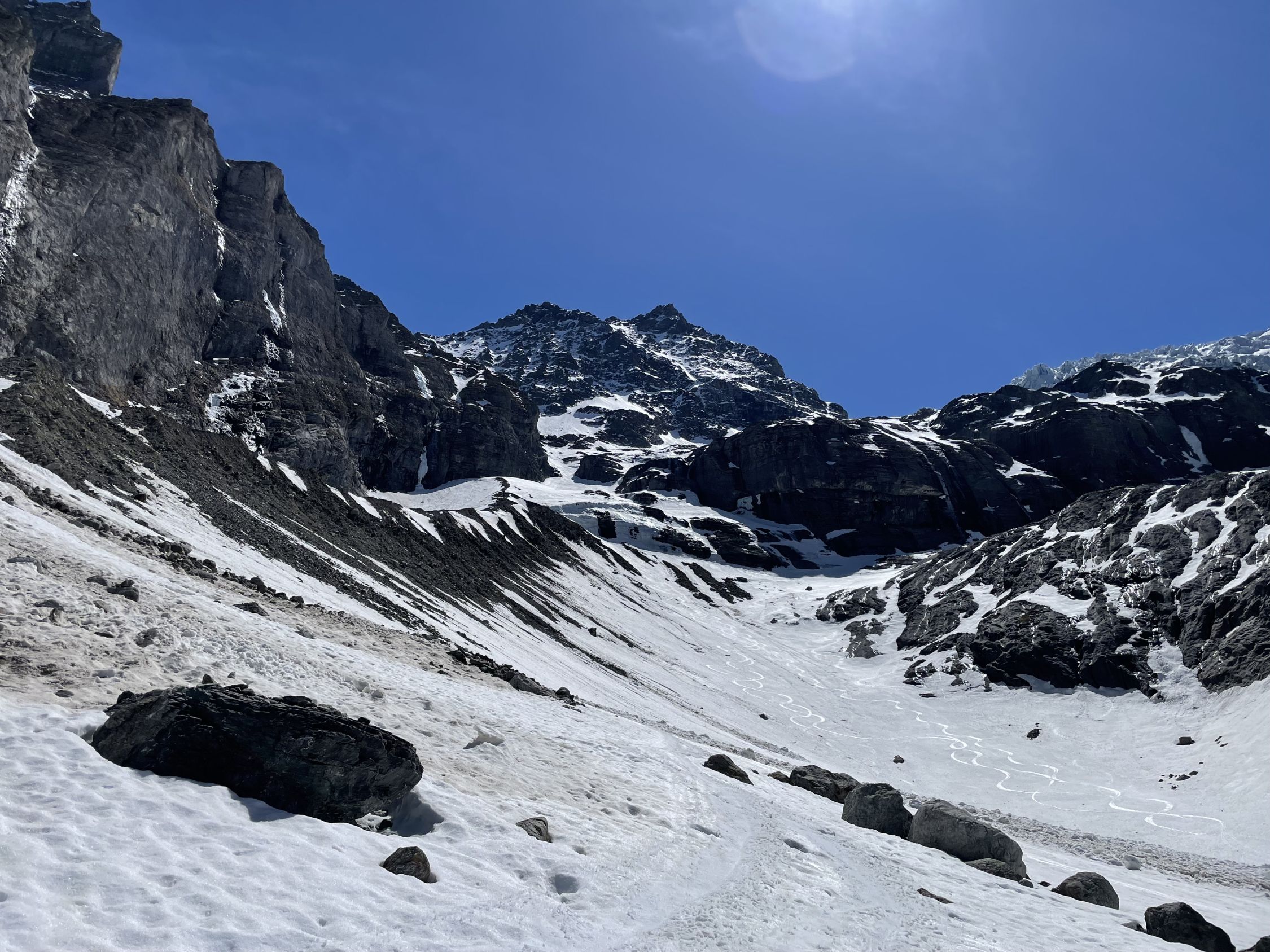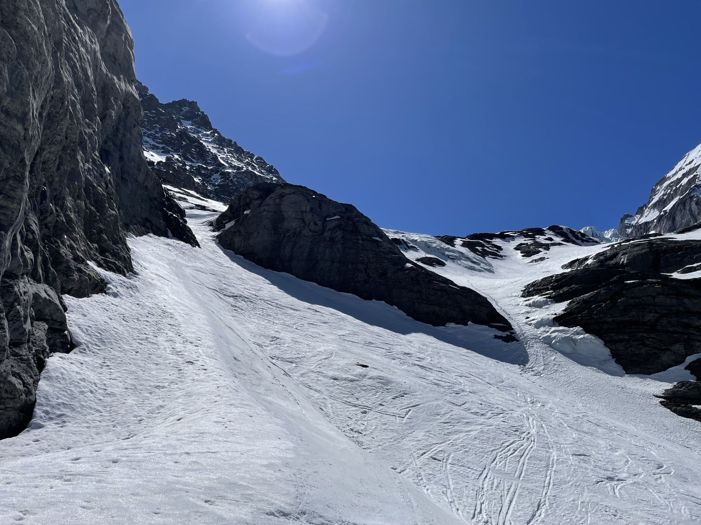 Umgehung des Fischmauls aktuell noch möglich mittels 2. Couloir, welches schneegefüllt ist und Trittspuren aufweist (siehe Foto). Müsste von oben her kommend in der Abfahrt weit nach links ausholend angepeilt werden