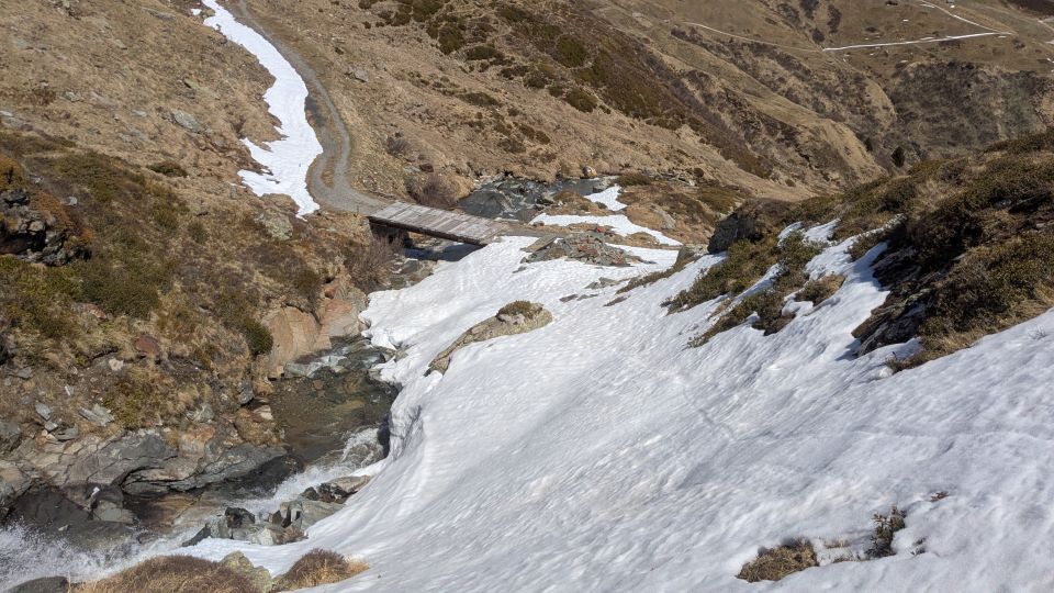 Start um 7.45 in Hinterrhein, von wo es mit dem Schneetaxi (E-Bike) über den komplett aperen, betonierten Chilchalpweg bis zur Brücke über den Rappierbach kurz vor der Alp geht (ca. 2110m, 4.4km, ~500hm, ~20min). Generell ist das Gelände auch auf dieser Höhe schon deutlich ausgeapert. Doch das Glück war mir hold: vom Bikedepot war noch alles komplett mit Ski machbar :-)