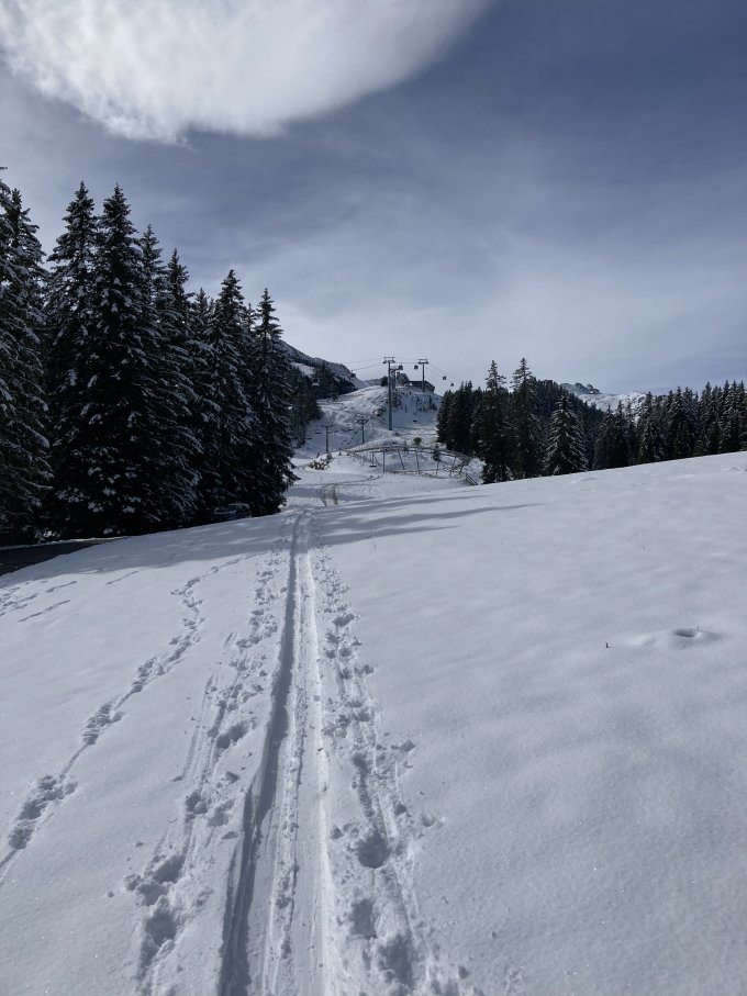 Abfahrt vom Gipfel bis Höhe Bergstation Prodkamm machbar, aber kein Vergnügen. Schöne Schwünge in den Mulden der Prodalp bis zum Verbindungsweg Rtg Bergstation Twärchamm. Querung zu dieser kurz zu Fuss. Sehr schöner Pulver bis zum Durchgang bei den Grappenchöpf. Rampe bis Chrüz verlangt Vorsicht, hier fehlt die Unterlage. Danach im Nassschnee in gerader Linie ohne Probleme bis zur Tannenbodenalp.