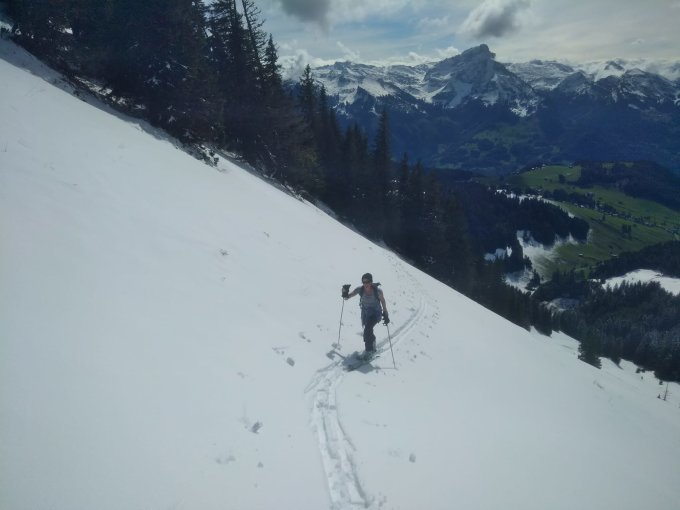 Mehr als "machbar" vielleicht verfehlt, hat sich aber gelohnt und hat Spass gemacht! Start mit den Ski auf 1270m, ging bis zum Gipfel und zurück ohne Ausziehen, im Gipfelbereich ca. 40cm Schnee. Dieser war mittags feucht, aber kompakt und nicht allzu klebrig. Die Abfahrt mit genussvollen Schwüngen und mit etwas Umsicht ohne Bodenkontakt.