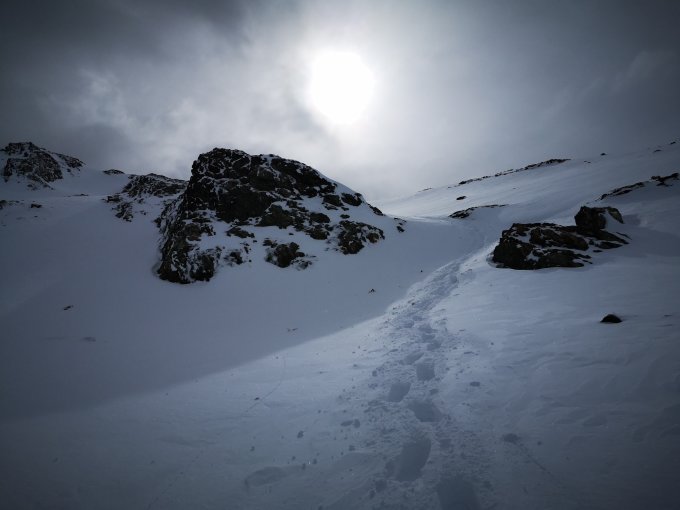 Bis Lunghin-See mühsam, da Wanderwege mit Triebschnee gefüllt sind. Ab dann schöne Grundlage für wackeres Vorwärtskommen. Gipfelhang gut machbar (Trittschnee) - Schluss etwas heikel, da zu fest abgeblasen und noch nicht ganz durchgefrorener Boden (= rutschig).
