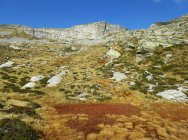 Sollte auch nach etwas Schneefall bald wieder aper sein, da keine nordexponierten Passagen. Bei Hartschnee für die beiden Querungen ggf. Pickel und Steigeisen.