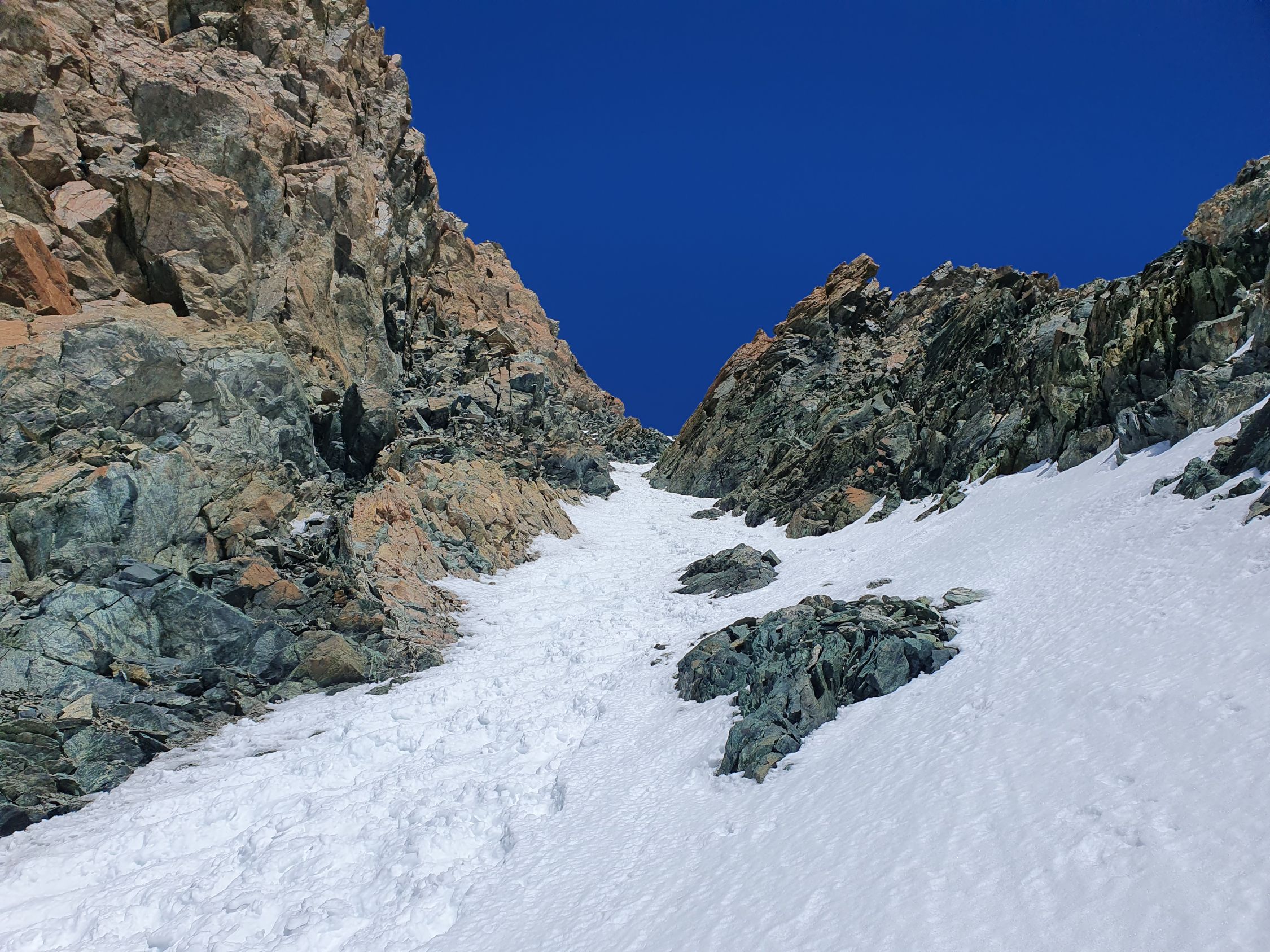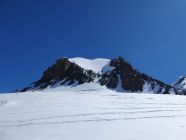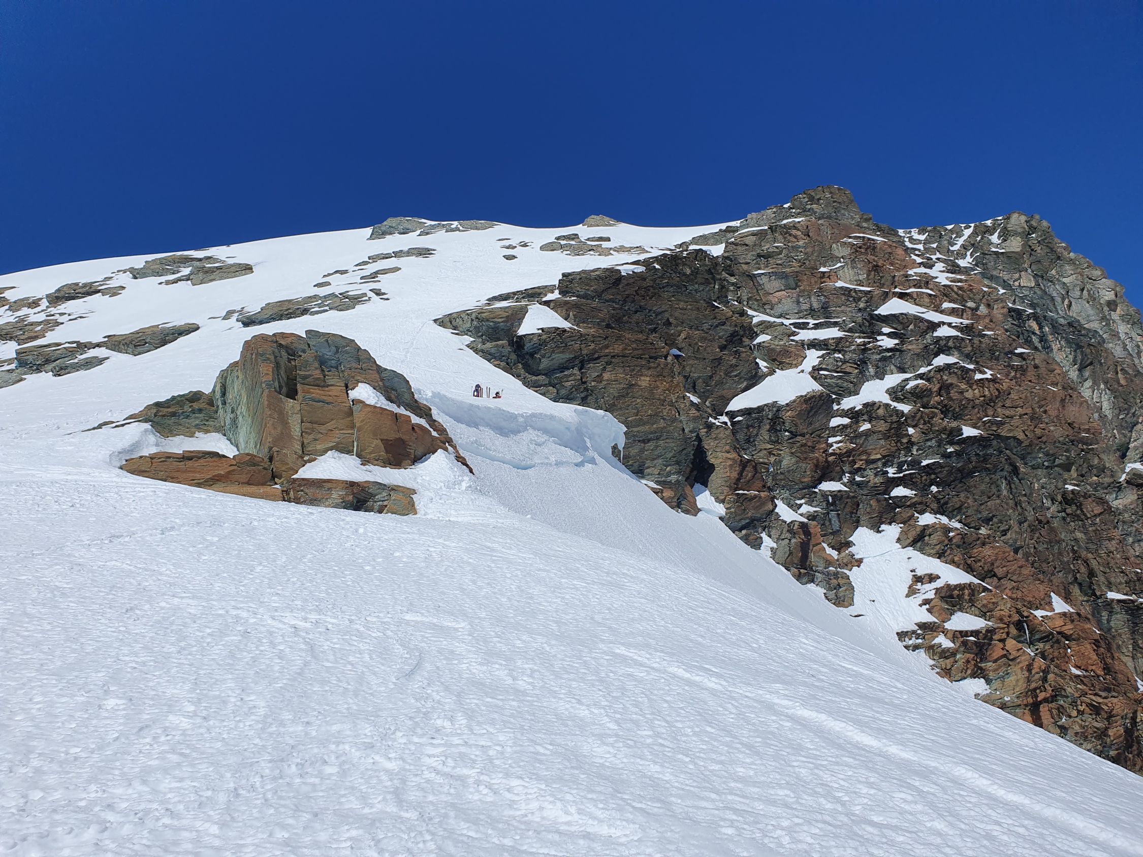 Bei 3688Hm felle ich wieder einmal an und steige zuerst ohne Spur steil und streng hoch nach N. In der Nähe des Bivacco Rossi e Volante CAI komme ich doch noch in den Genuss einer Aufstiegsspur. Die Sonne hat diese SW-Flanke stark aufgewärmt und so sacke ich, trotz Spur, immer wieder durch die Spur durch. Zudem steilt sich das Gelände weit über 40° immer steiler auf. Ab 3900Hm sehe ich ein Skidepot, möchte jedoch weiter mit Ski versuchen, und komme so mit unzähligen Spitzkehren doch noch irgendwie bis zum Roccia Nera. Ich schaue auf die Uhr und sie zeigt 17:00 Uhr. Nun verstehe ich auch, warum ich kmin der Gegend keine Leute mehr sehe, denn bald gibt es in den Hütten ja schon Nachtessen.