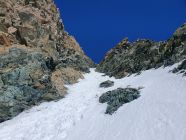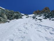 Anschliessend muss der Felsklotz westlich in gutem Trittschnee kurz umgangen werden. Der weitere Weg bis zum Schneecouloir verläuft schon fast auf einem aperen Pfad nach SE (I). Ich könnte den SE-Grat weiter so hinab laufen, doch meine Steigeisen wünschen da doch lieber das schneegefüllte Couloir.