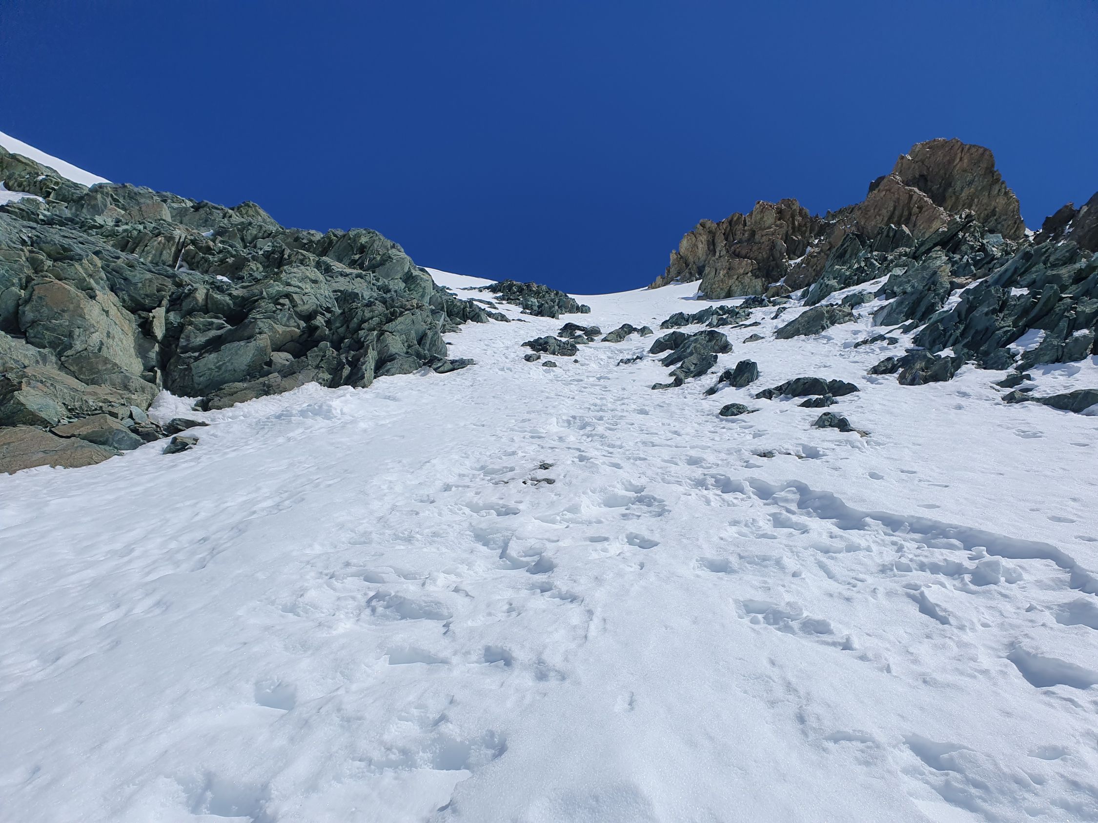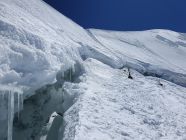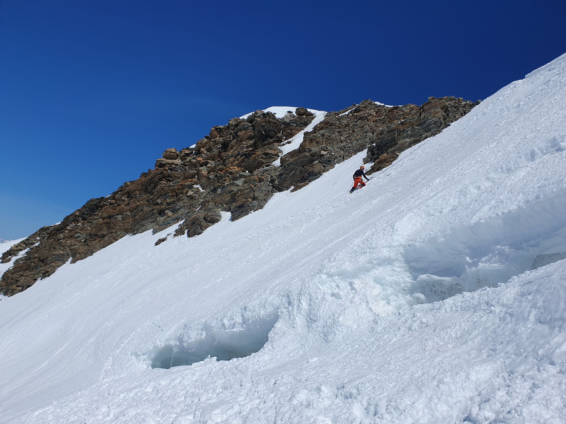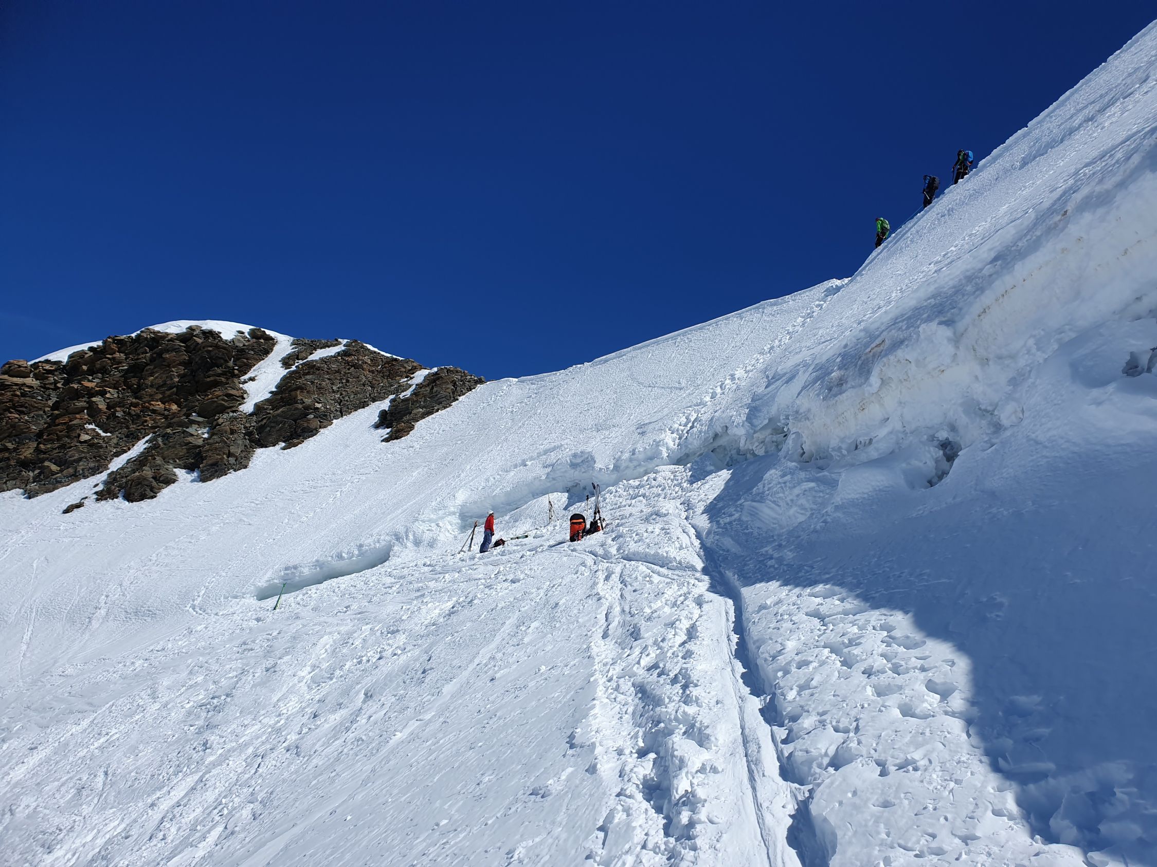 Heute scheinen alle die Normalroute zum Pollux zu wählen. Ich wähle jedoch die steile W-Flanke. Das Couloir dort weist aktuell noch durchgehend Schnee auf. Es hat hier zwei Aufstiegsspuren drinnen. Doch für eine direkte Skiabfahrt vom Pollux hat sich bis anhin noch niemand getraut. Die Flanke ist um die Mittagszeit dafür leider noch immer viel zu hart. So lasse ich sie doch lieber unten. Skidepot mache ich bei 3825Hm.