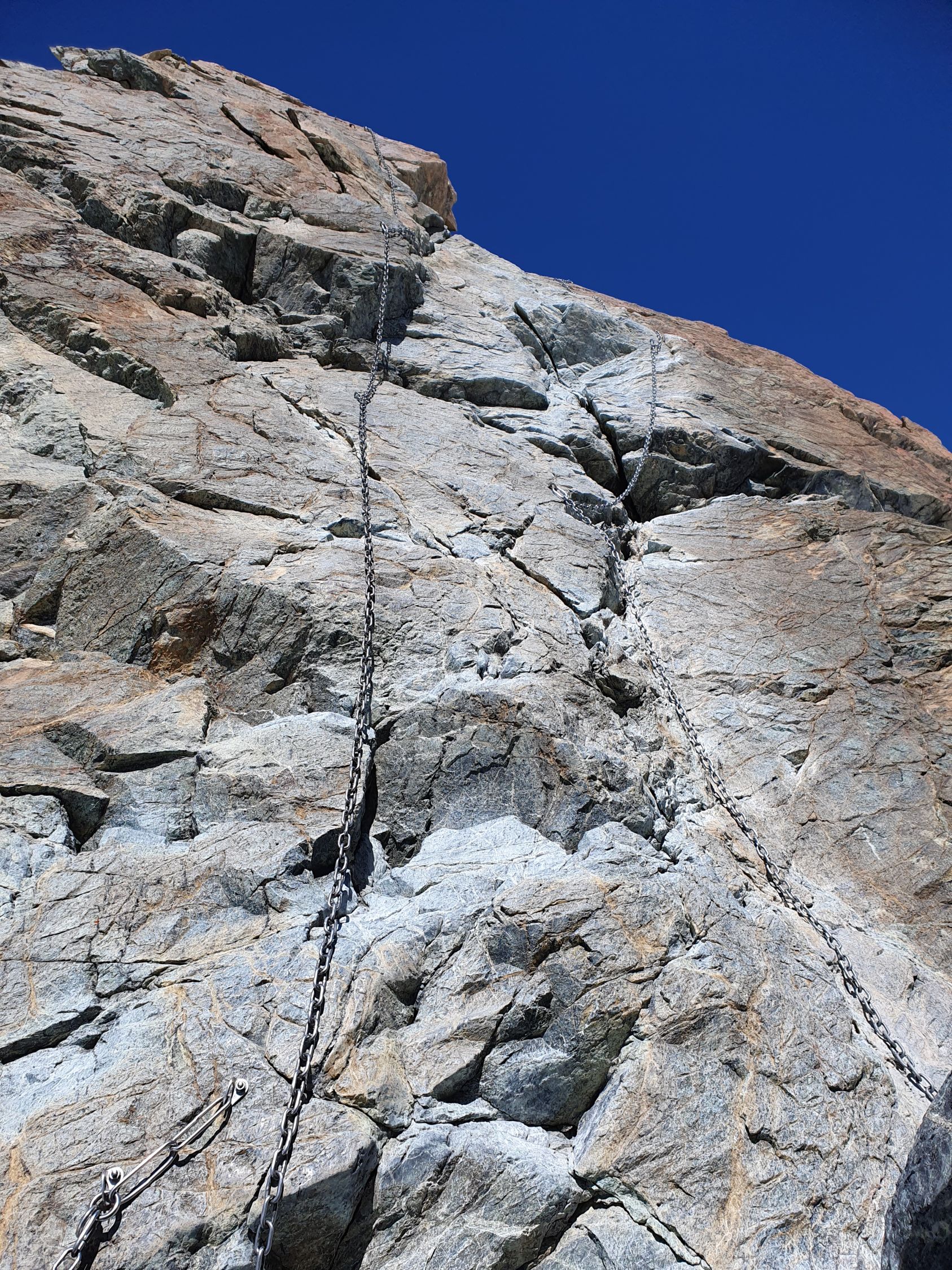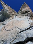 Ich steige auf guter Spur wieder hinab zur Madonnastatue, bestaune sie, und entscheide mich, aus Neugier, die Normalroute hinab zu steigen. Hier fängt der Kettenzirkus an. Oben neben der Statue hat es eine Abseilstelle. Die erste 10 Meter senkrechte Wand ist auf beiden Seiten mit Ketten geschmückt. Der Fels weist zwar Haltegriffe auf, jedoch sind diese von den vielen Leuten wie glanzpoliert und dementsprechend rutschig. Wie ein Affe klammere ich mich an den Ketten und klettere so hinab. Danach kommen nochmals 5 Meter nach Westen und dann stehe ich südlich an die berüchtigte plattige Felswand mit sehr wenigen Griffe. Doch der Affe klammert weiter gekonnt hinab und bekommt sogar noch Freude an den Ketten... Nur schade, dass ich keine Banane mehr dabei habe...