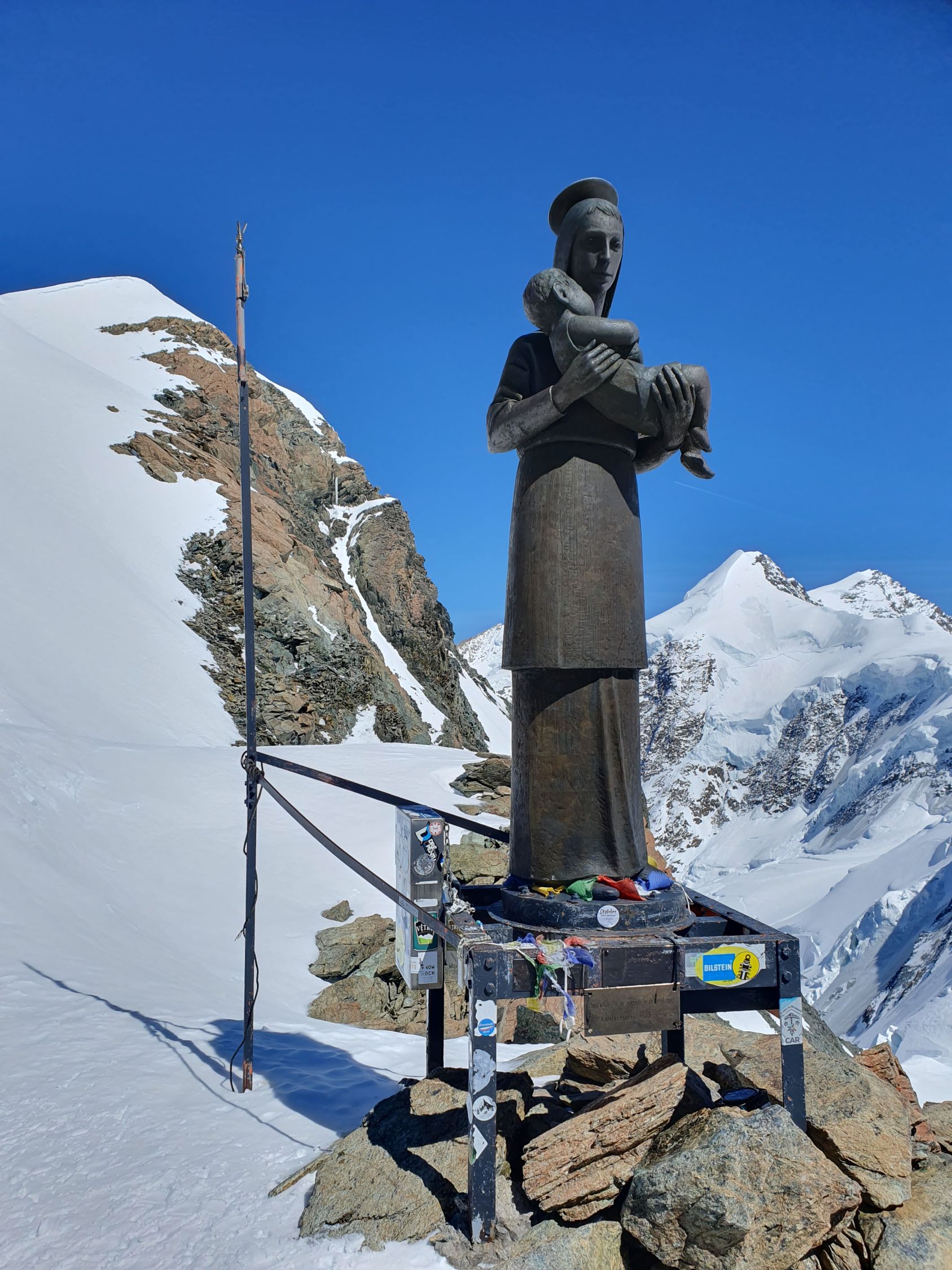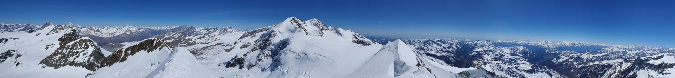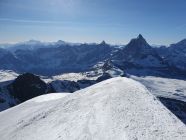 Mit Steigeisen und Pickel komme ich ohne Probleme in gutem Trittschnee oben direkt bei der Madonnastatue raus. Nach einem kurzen Gratspaziergang geniesse ich auf dem Pollux ganz alleine die gute Fernsicht (Meteo sei Dank) und staune, dass die W-Flanke vom Castor von hier aus viel steiler aussieht als sie war.