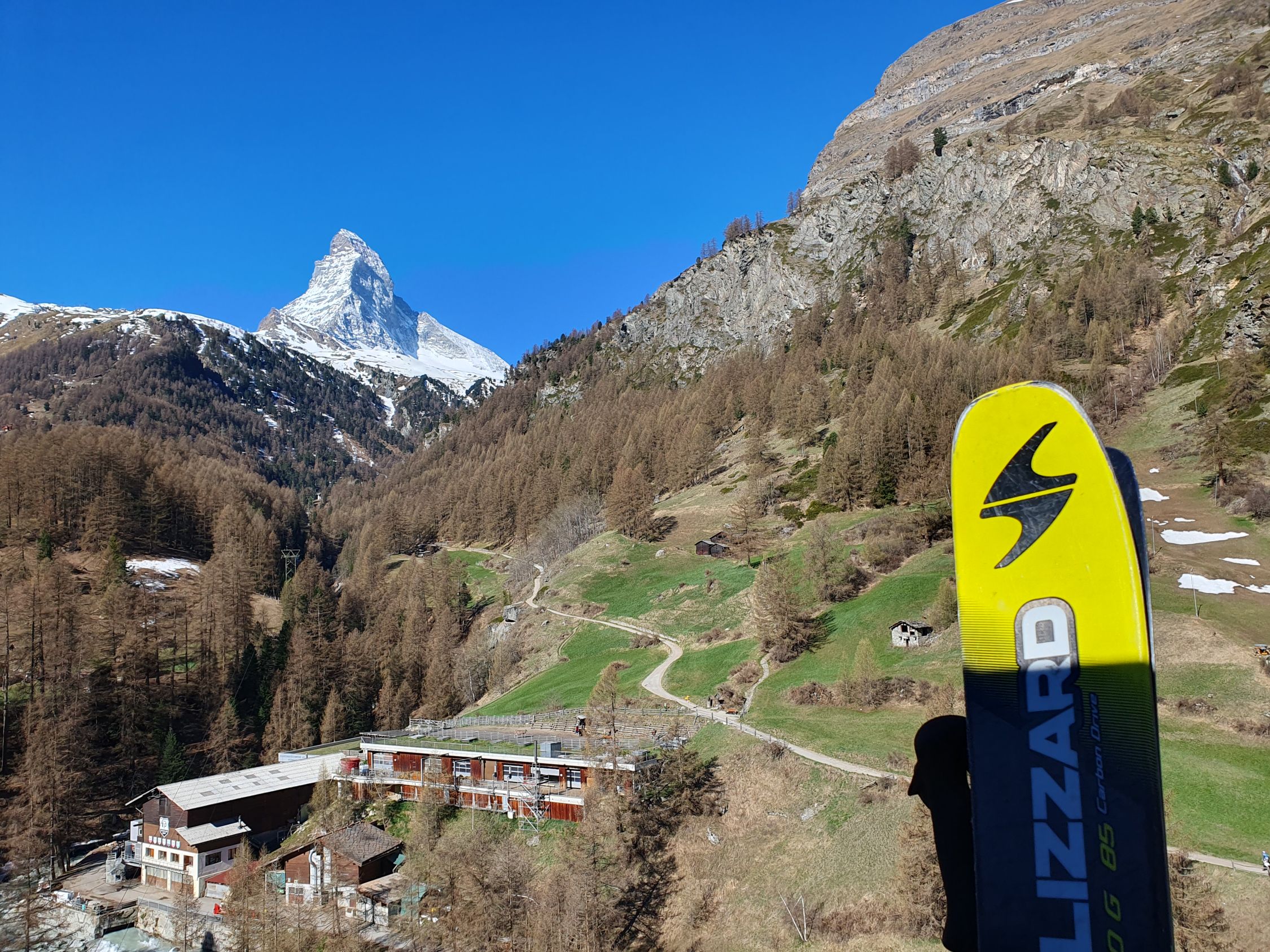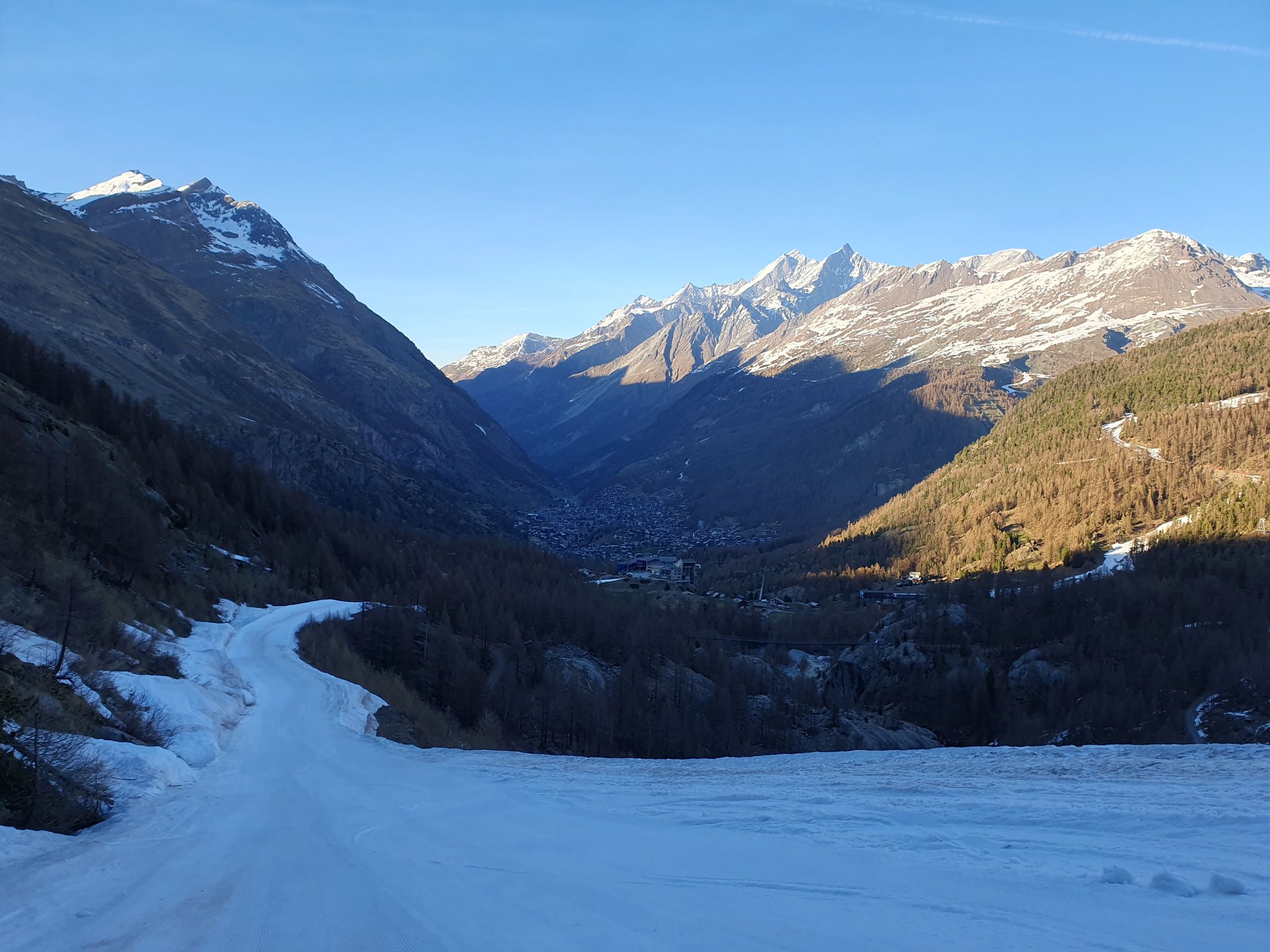 Nachdem ich alle meine Resten an Essensvorräte aufgegessen habe (darum liebe Ungaren konnte ich nichts geben), fahre ich nun endgültig hinab nach Zermatt. Die Abfahrt hinab zum Klein Matterhorn ist mit Schwung sehr ruppig, aber dafür schnell erreicht. Danach fahre ich auf die präparierten Pisten hinab bis nach Zermatt. Oben Hart- und unten Sulz, dies gilt auch für die Pisten...