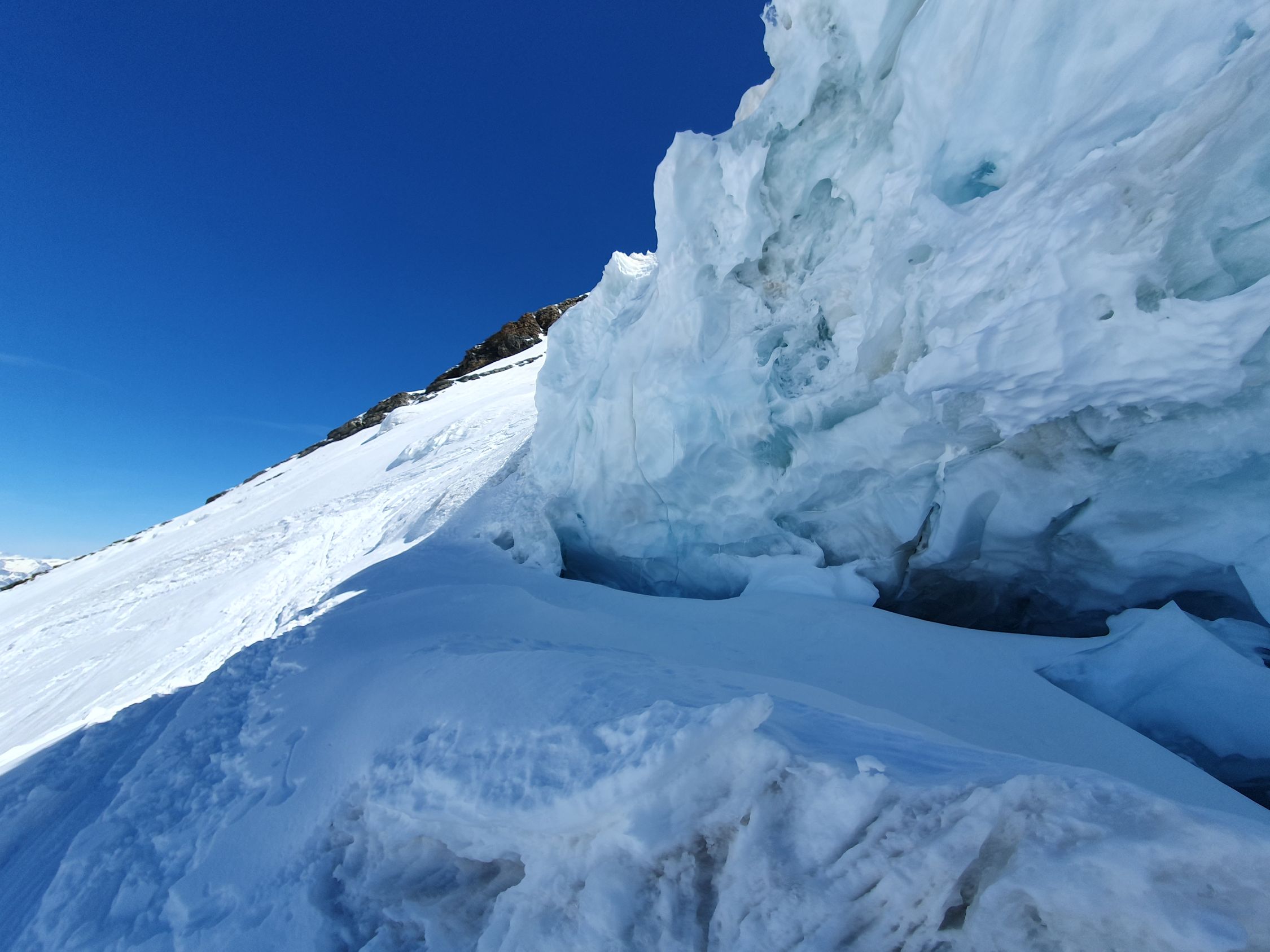 Um 10:30 starte ich vom Klein Matterhorn, als einziger mit T-Shirt, die Abfahrt. Ohne Felle an den Ski und mit etwas Stockeinsatz laufe und fahre ich auf dem Grande Chiacciaiodi Verra, auf dem ich sehr wenige Spalten sehe, bis unterhalb vom Schwarztor bei ca. 3655Hm (30 Min.). Hier felle ich an und laufe unter dem Pollux vorbei zum Zwillingsjoch (1 Std.). Auf einer guten Spur steige ich auf Hartschnee sehr angenehm ohne Harscheisen im Zickzack die steile W-Flanke des Castors hoch. Am Rande sind nur wenige Spalten zu sehen und in der oberen Hälfte hat es ein paar kleine Eisflächen, die aber weniger stören als die Abrutschflächen der Abfahrer. Der Bergschrund auf 4198Hm (Skidepot) kann kurz vor dem Grat nicht mehr mittig, so wie im Bericht von Adrian (19.04.26), zu Fuss überwunden werden. Denn das Loch ist aktuell dort zu gross geworden. Aktuell kann der Grat gut nördlich davon in gutem, aber hartem, Trittschnee erreicht werden. Beim Anziehen der Steigeisen seilt sich dort eine Gruppe mit Bergführer hinab. Es hat oben am Fels genug Sicherungsmöglichkeiten. Oben habe ich den Castor für mich alleine. Doch schon bald mache ich Bekanntschaft mit 2 sehr netten Ungaren, die mir sogar ein Stück weisse Toblerone spendieren. Eigentlich sollte es umgekehrt sein, da sie bei uns in der Schweiz Gäste sind, doch heute benötige ich unbedingt mein ganzes Proviant.