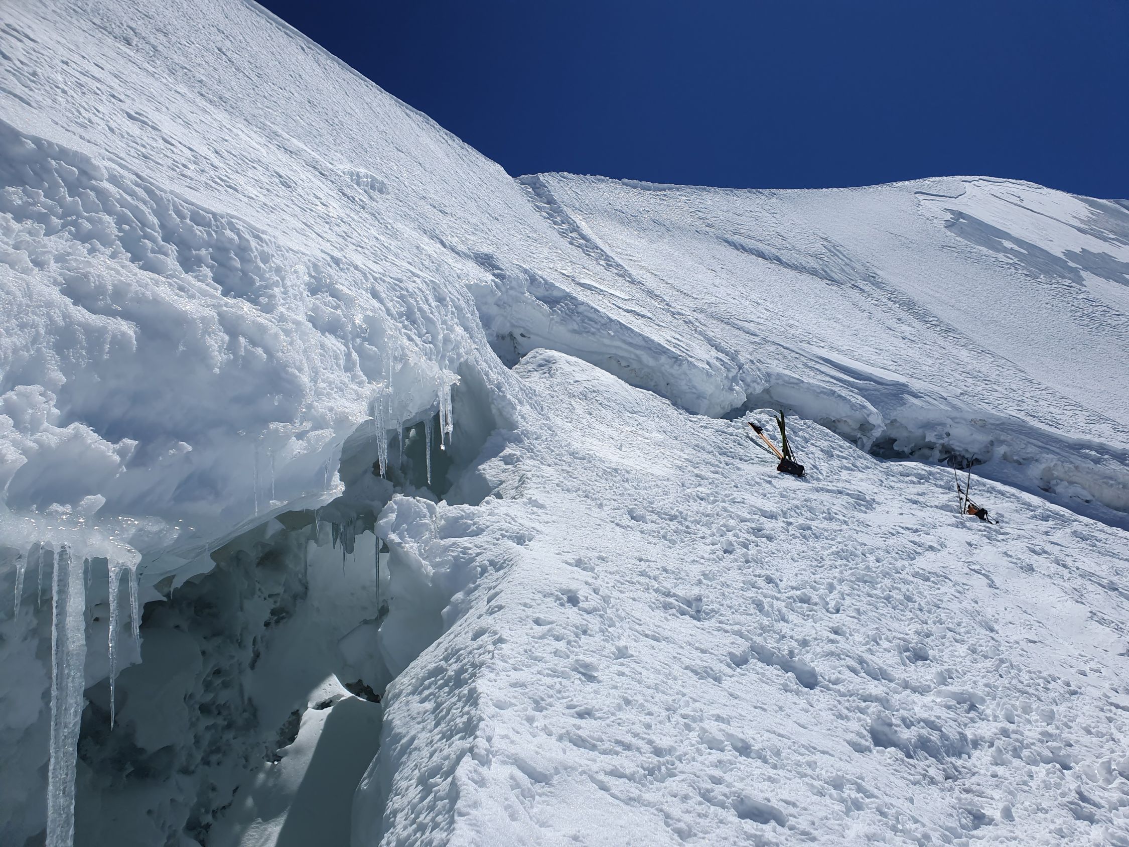Ich steige die steile Passage ungesichert rückwärts hinab zum Skidepot und die zwei Kollegen seilen sich dort ab. Ich verabschiede mich und fahre ab.