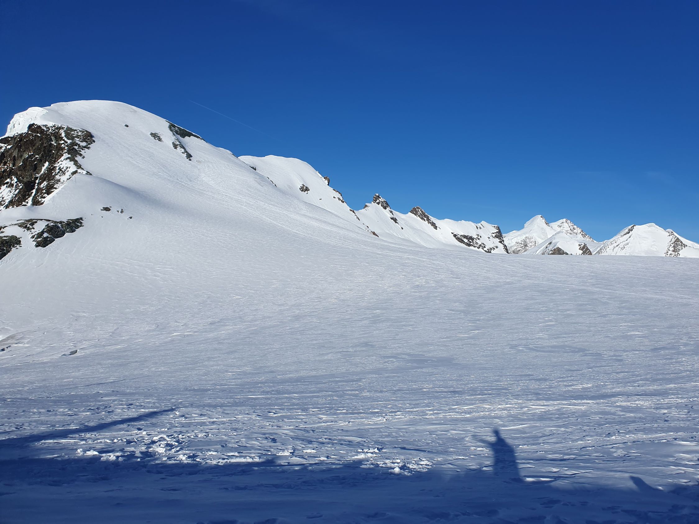 Der Schnee ist um diese Zeit wieder härter geworden, was das Spuren im unteren Teil deutlich einfacher macht. Später komme ich doch noch in den Genuss auf die Autobahnspur, die sich vom Klein Matterhorn hochzieht.