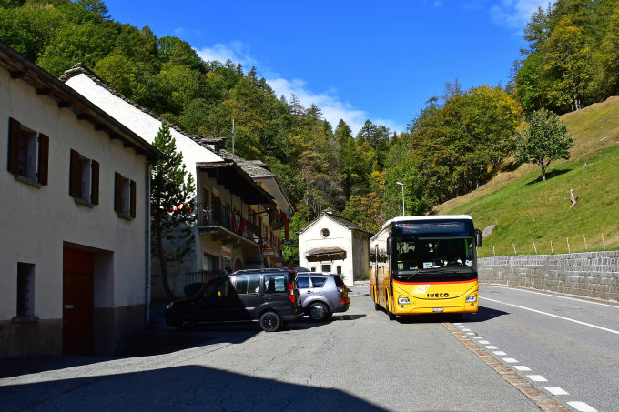 Auf der ganzen Route bin ich dann niemand begegnet und der Kontrast zu den überfüllten Zug könnte nicht grösser sein. Später stellte sich heraus, dass es besser wäre wenn wenigstens eine Person ab Zwischbergen nach Gondo fahren würde, denn das Postauto kam nicht... Ja, eben, ein Rufbus, so stellte sich bei genaueren Anschauen heraus. Ich dachte, die Reservierung betrifft Velomitnahme, war aber für alle Reisenden nötig. Und da keiner reserviert hatte... Was nun? Laut Wegweiser 2 Stunden nach Gondo wo um 18:00 das letze Postauto abfährt (es ist 17:35). Im Hotel gab es kein Platz, also los marsch nach Gondo. Zum Glück kam auf etwa halber Strecke ein Auto und ich durfte mitfahren. In Gondo versuchte ich Autostopp in Richtung Iselle und einen Italienischer Grenzgänger nahm mich mit. Um 18:17 war ich am Bahnhof und rannte zum Gleis, zum Glück das richtige und dank Sichtkontakt und einige Sekunden warten des Lokführers, konnte ich um 18:19 im Zug hereinspringen...