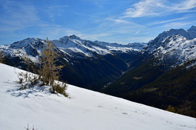 Eigentlich bis Furggu gut machbar, aber weiter oben gab es dann trotzdem noch einiges an Neuschnee und es musst mehr gespurt werden als mir lieb war. Kurz unterhalb der Schneegrenze war es dann auch recht nass.
