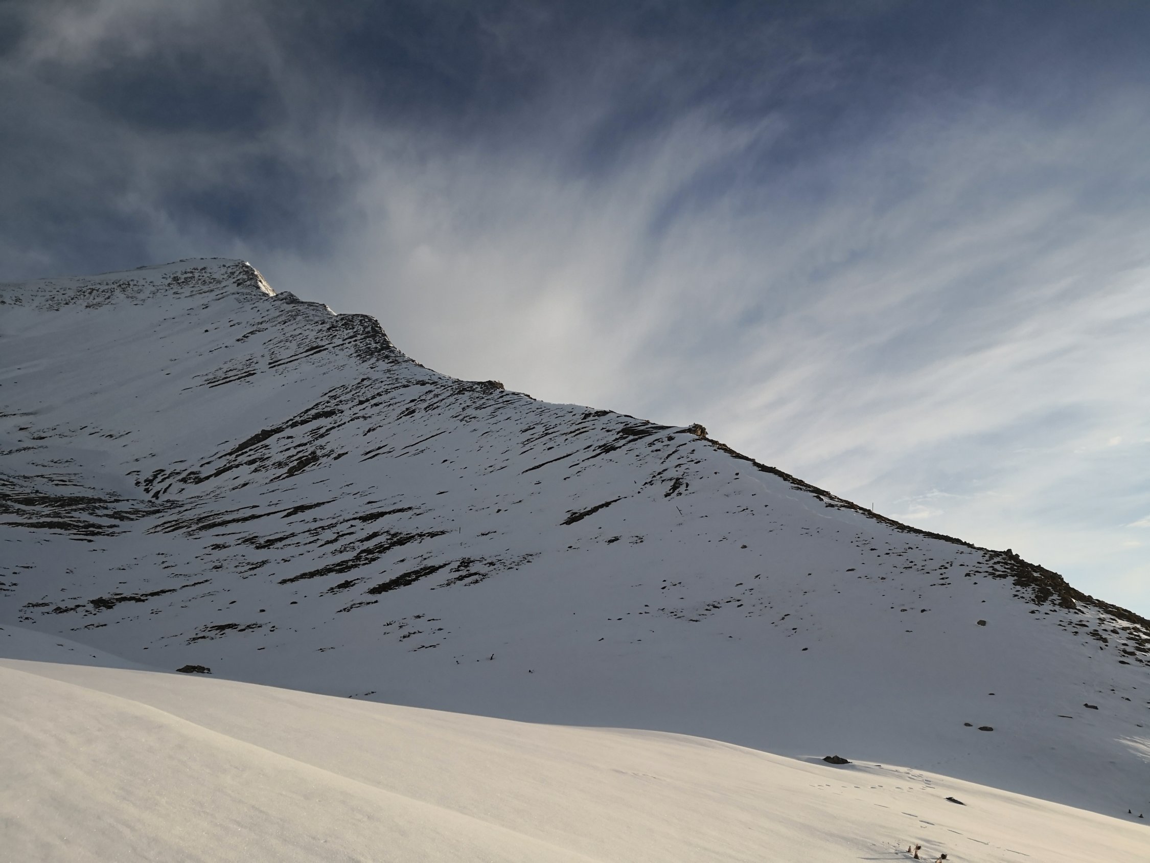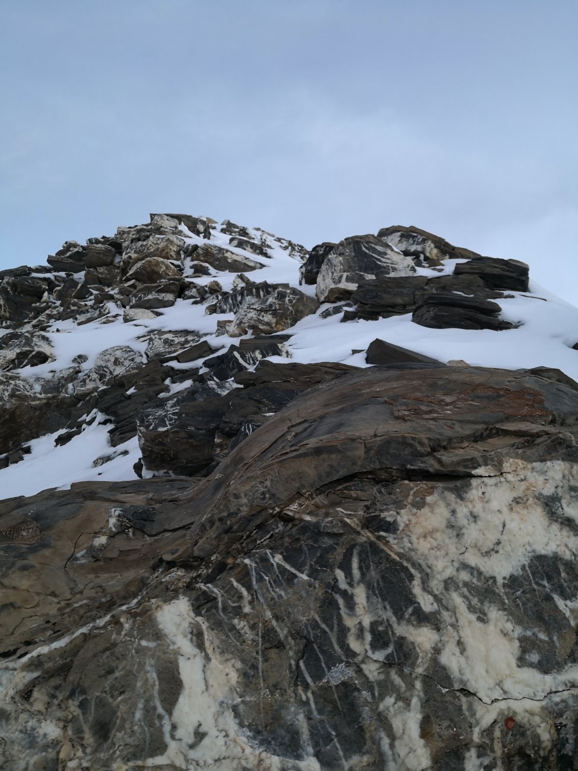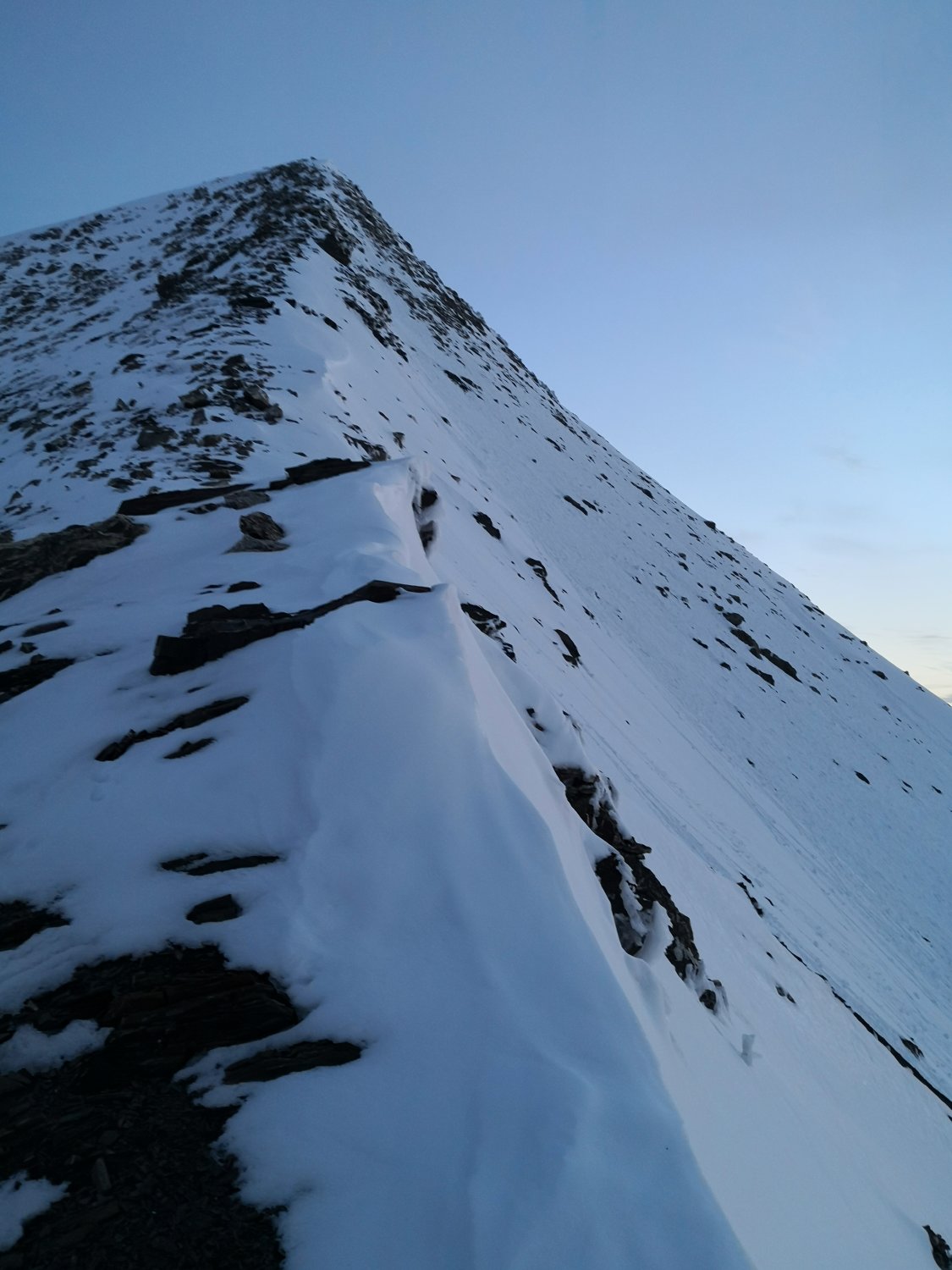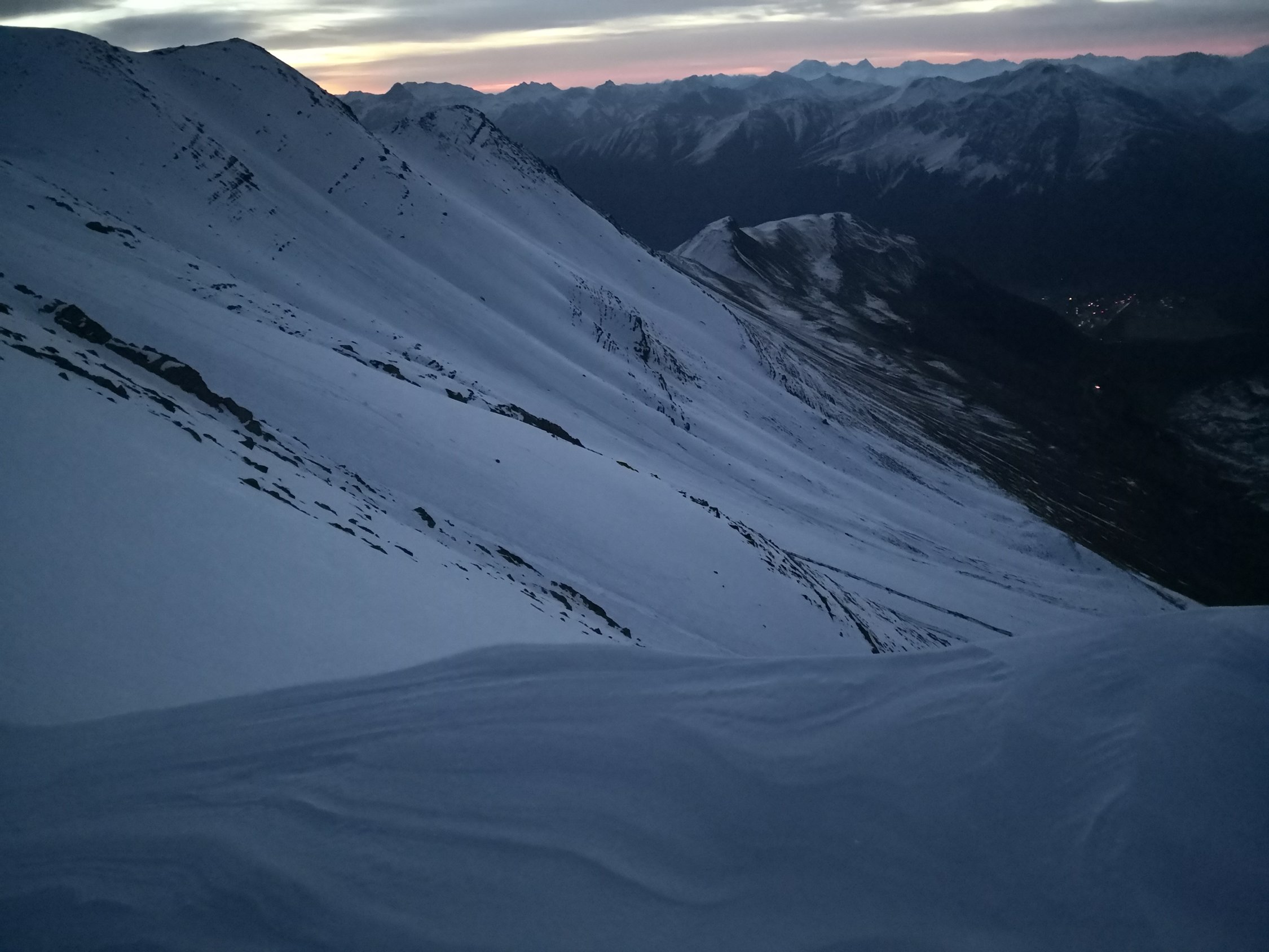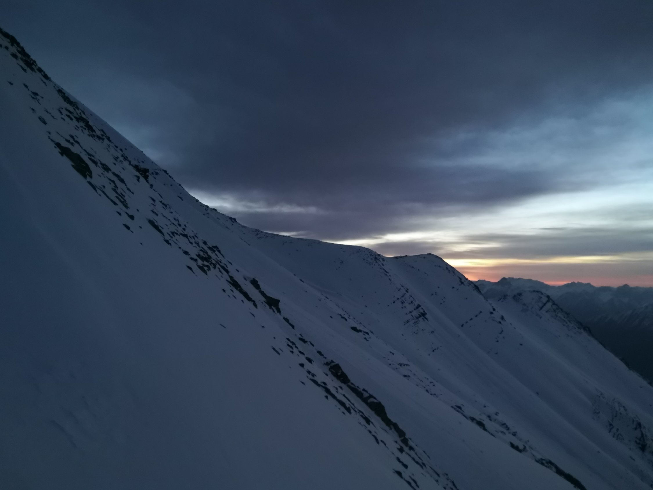 Bim um ca. 05.15 gestartet, wollte den Sonnenaufgang auf dem Gipfel erleben. Zuerst noch ohne Schneekontakt bis ca.2450m, ab diet durchgehend Schnee.. Schade, dass ich die Ski nicht dabei i hatte, wäre heute gegangen, obwohl rechter Deckel vorhanden. Dann über den Südgrat immer weiter hinauf, mehrmals kommt das Gefühl kurz vor dem Gipfel zu sein um dann leider zu bemerken, dass nochmals ein Grataufschwung kommt, irgendwie wollte der Grat bmbicht Enden. Zunehmend mehr Schnee, sehr rutschige Schotter und kurz vordem Gipfel dann Umkehr infolge Sehr hart gefrorener Schneeoberfläche, tja, Steigeisen zu Hause gelassen, ob e fiese for mich Schluss... 50hm unter dem Gipfel. Sicherheit geht vor, Abstieg dann zuerst wieder über den Grat, dann bei ca. 2950m in die Südwestflanke gequert, da dort guter Schnee lag für Abstieg. In knapp 45min wieder runter zur Passstrasse.