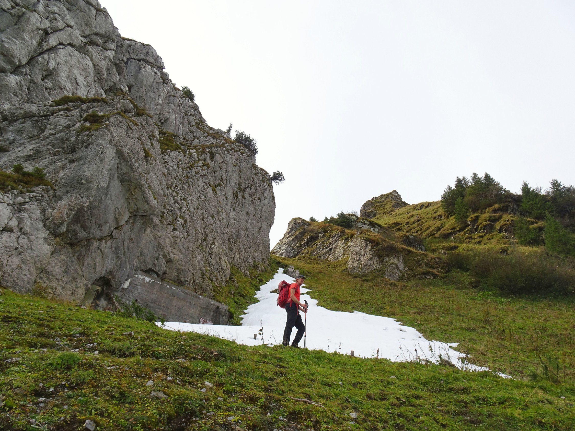 Abstieg in der Ostflanke auf den oberen 100 hm noch etwas Schneeauflage, da leichtes Gelände aber unproblematisch. Sehr lehmig-rutschig dann der waldige Wegabschnitt oberhalb des Sees.