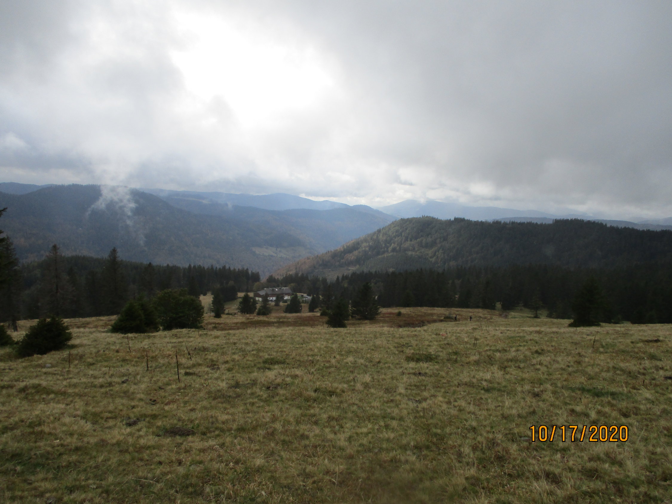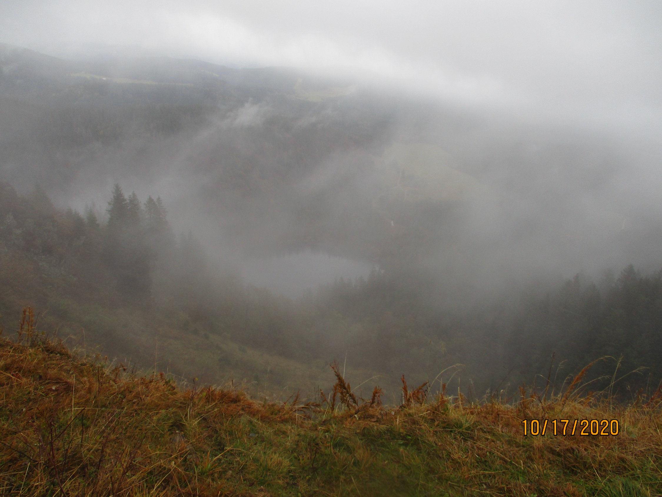 Bis hinauf zum Gipfel ganz ordentliche Aussichten zu den nächstgelegenen Bergen und Tälern bei geschlossener, grauer Wolkendecke. Keine Fernsicht, aber zunächst auch kein Niederschlag. Später nebelte es auf dem Gipfel zu und es begann leicht zu schneien.