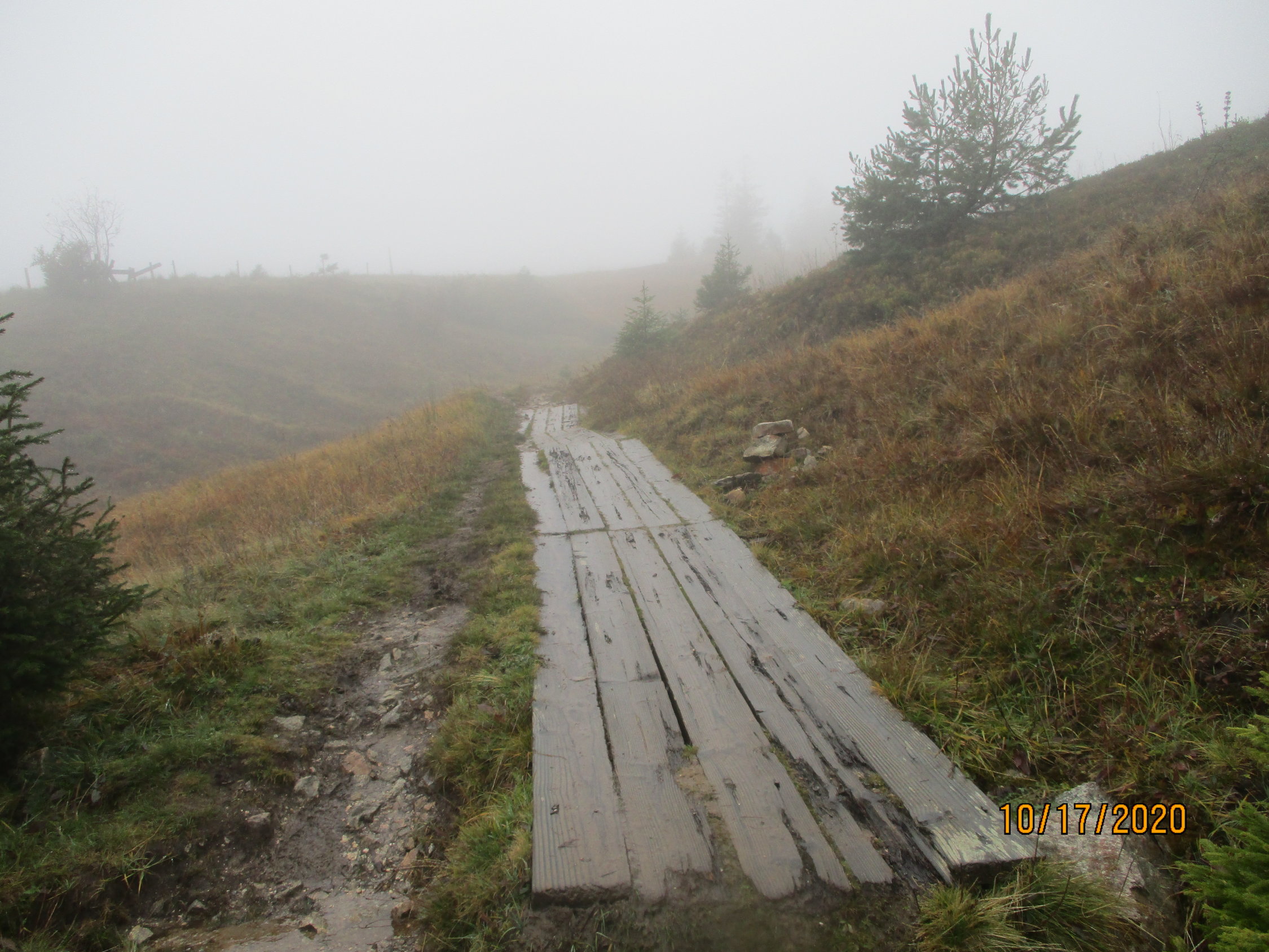 Sehr nasse Pfade, auf dieser Route jedoch ungefährlich. Nur bei den teils glitschigen Holzbohlen im Wiederanstieg via Westweg zum Grübensattel musste etwas aufgepasst werden.