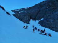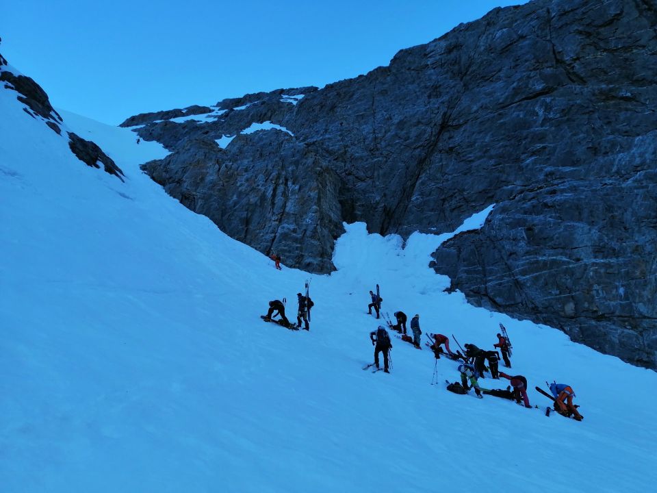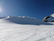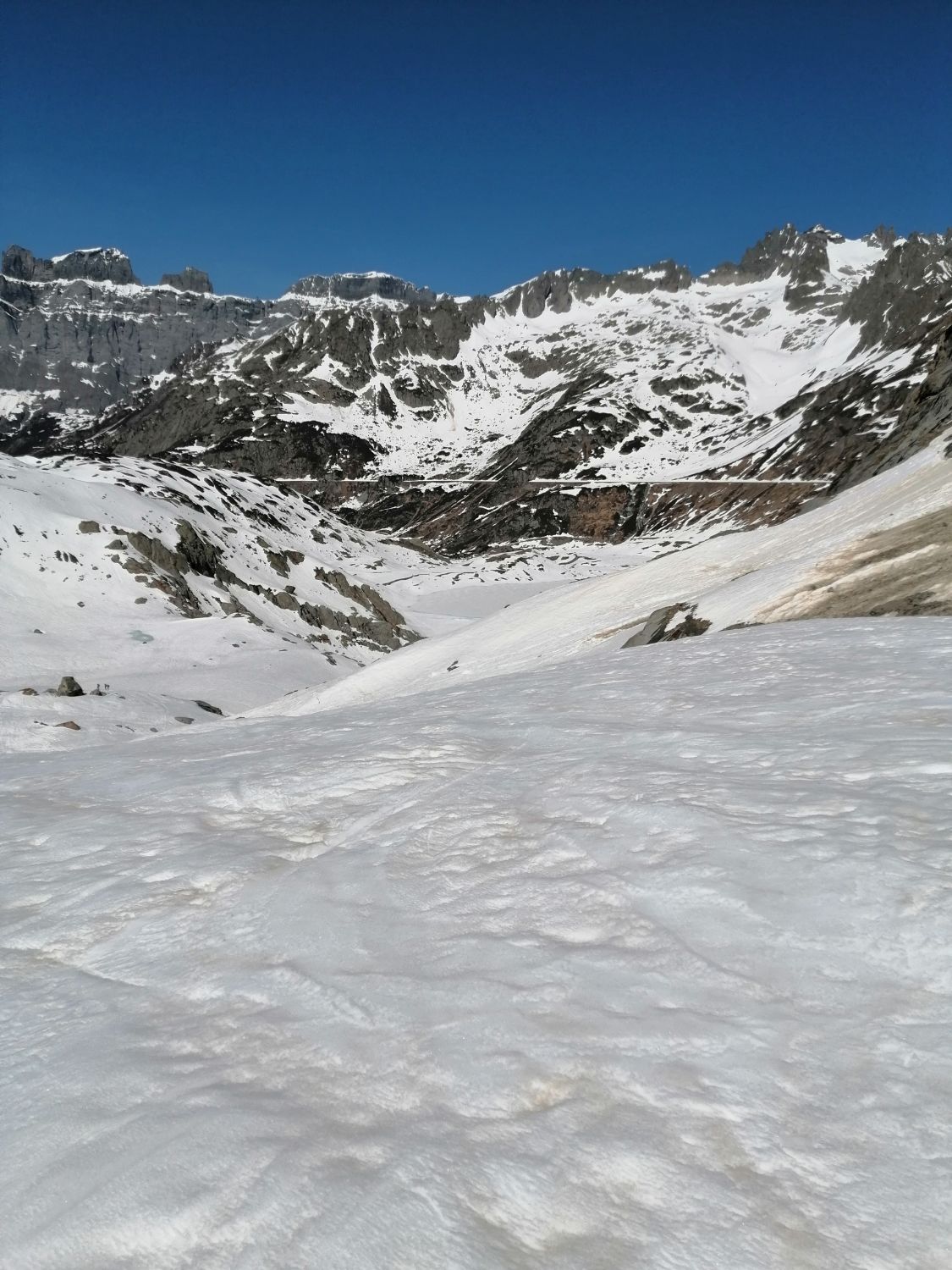 Man kann gleich von der Lodge mit Skiern gehen. Bislang reine Räumaktivitäten auf der Militärstrasse. Wie schon öfter beschrieben geht der beste Weg am See entlang durchs Tal und nicht über Chöbärgli. Beim Anfang des Toteises kann man links oder rechts (Skulpturenpark) gehen, wir sind rechts hoch aber dann links (östlich) abgefahren. Die Steilstelle haben wir (und alle anderen) mit Pickel&Eisen überwunden, in der Abfahrt kann man ganz gut von Norden her hereinquerend im südlichen, noch durchgehenden Eisschlauch abrutschen. Restlicher Anstieg ohne Probleme.