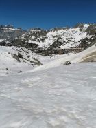 Oben hartgepresst mit etwas körniger Auflage, man kann bei 3300m auf den besonders guten Hang direkt westl. des Gipfels wechseln, ab 3000m dann schöne Sulzauflage, wunderbar zu fahren. Bei 2900 trifft man wieder die Aufstiegsspur. Auch ganz unten recht gut gesetztes Fundament. Gute Abfahrtszeit vom Gipfel ist 12:00 bis 12:30.