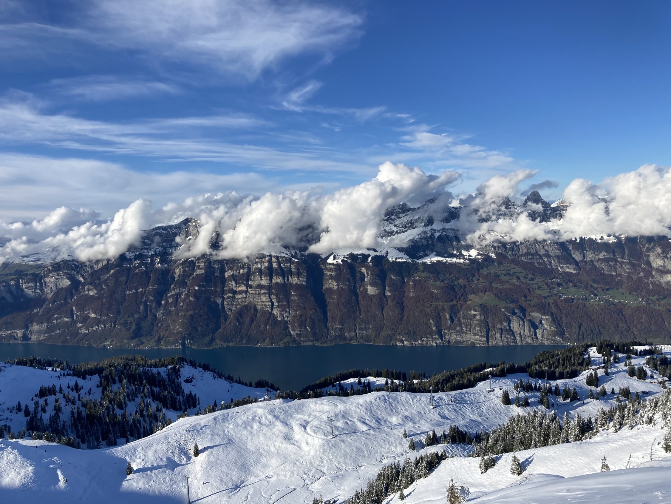 Beim PP Tannenbodenalp am frühen Nachmittag ca. 20cm frischer Zement. Mit zunehmender Höhe schnell mehr und trockner. Insgesamt schon gut gesetzt. Osthänge bereits gedeckelt. Nord und West Expositionen der Abfahrt aber tiptop. Für Ende Oktober sehr schöne Verhältnisse.