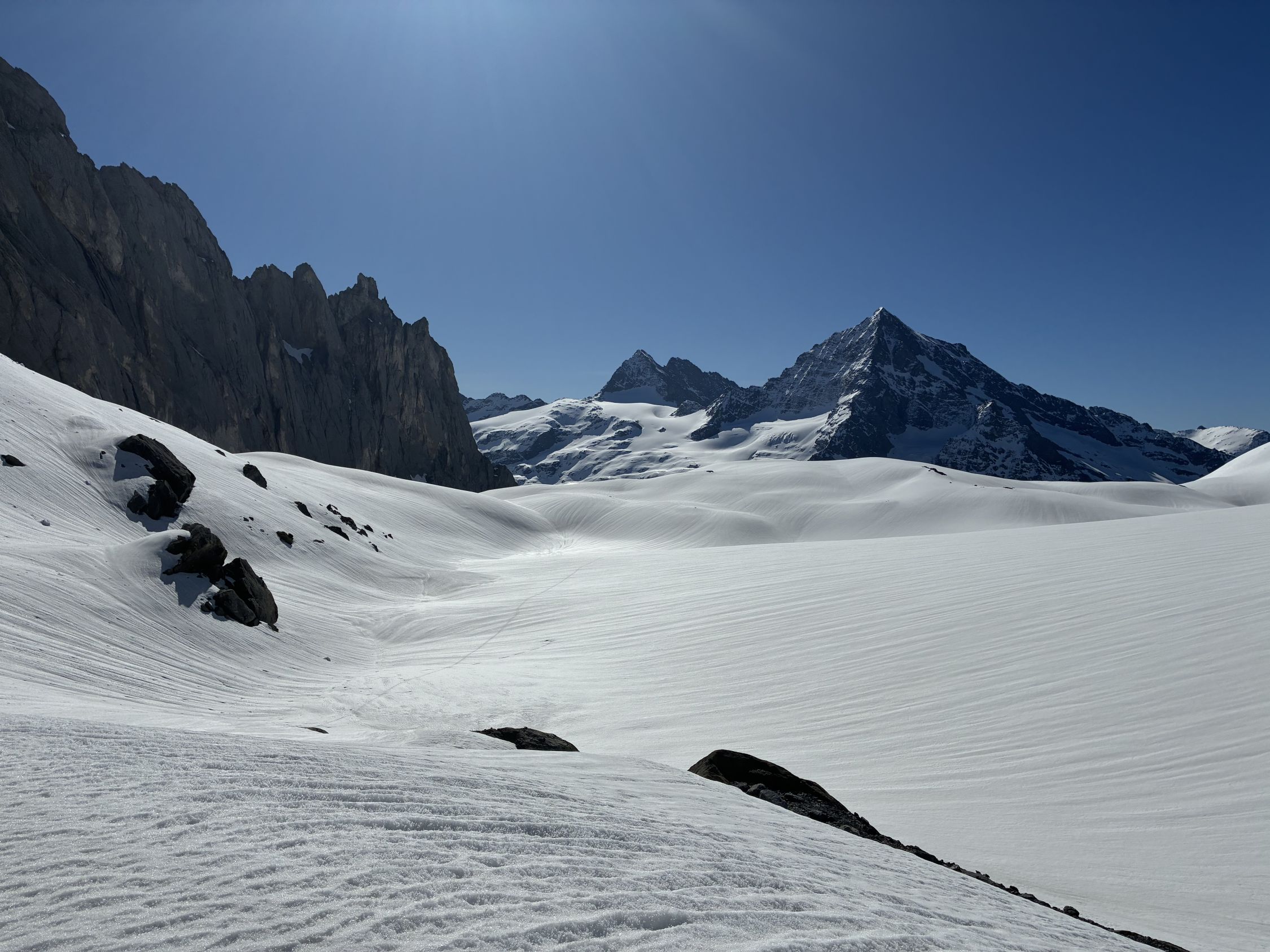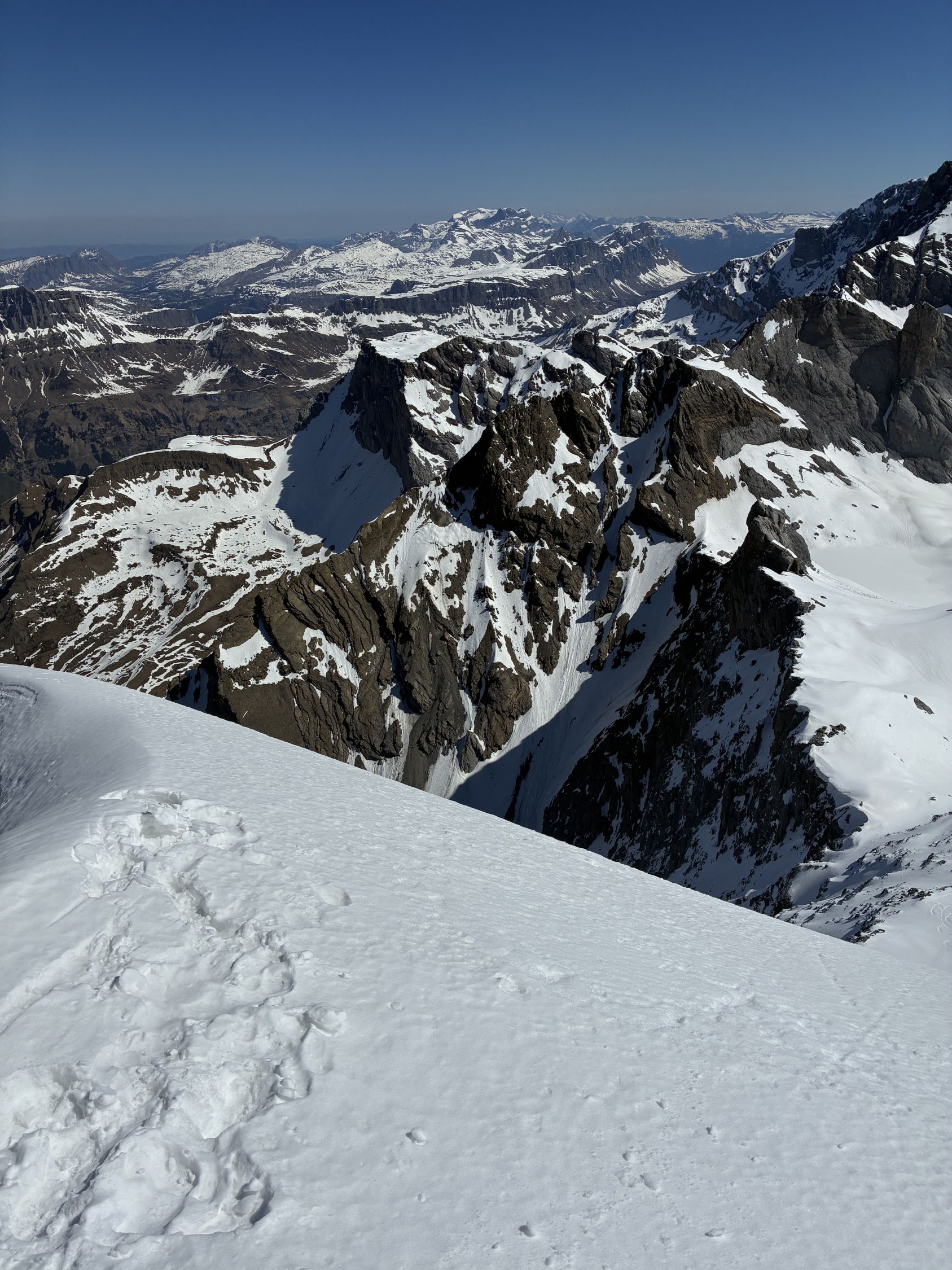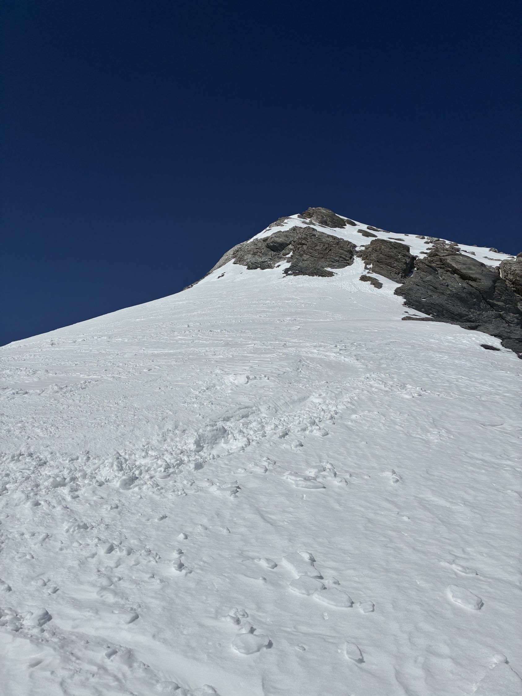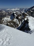 Ab Ruchchälenpass dann griffige Spur in der Sonne. Fussaufstieg Gipfel problemlos, schöne Abfahrt (Sulz) bis Pass. Chälen um 11:30 Uhr hart, Devise runterschreddern. Nicht schön, aber auch nicht schlimm. Das Bier wartet ja in der Brunnibeiz!