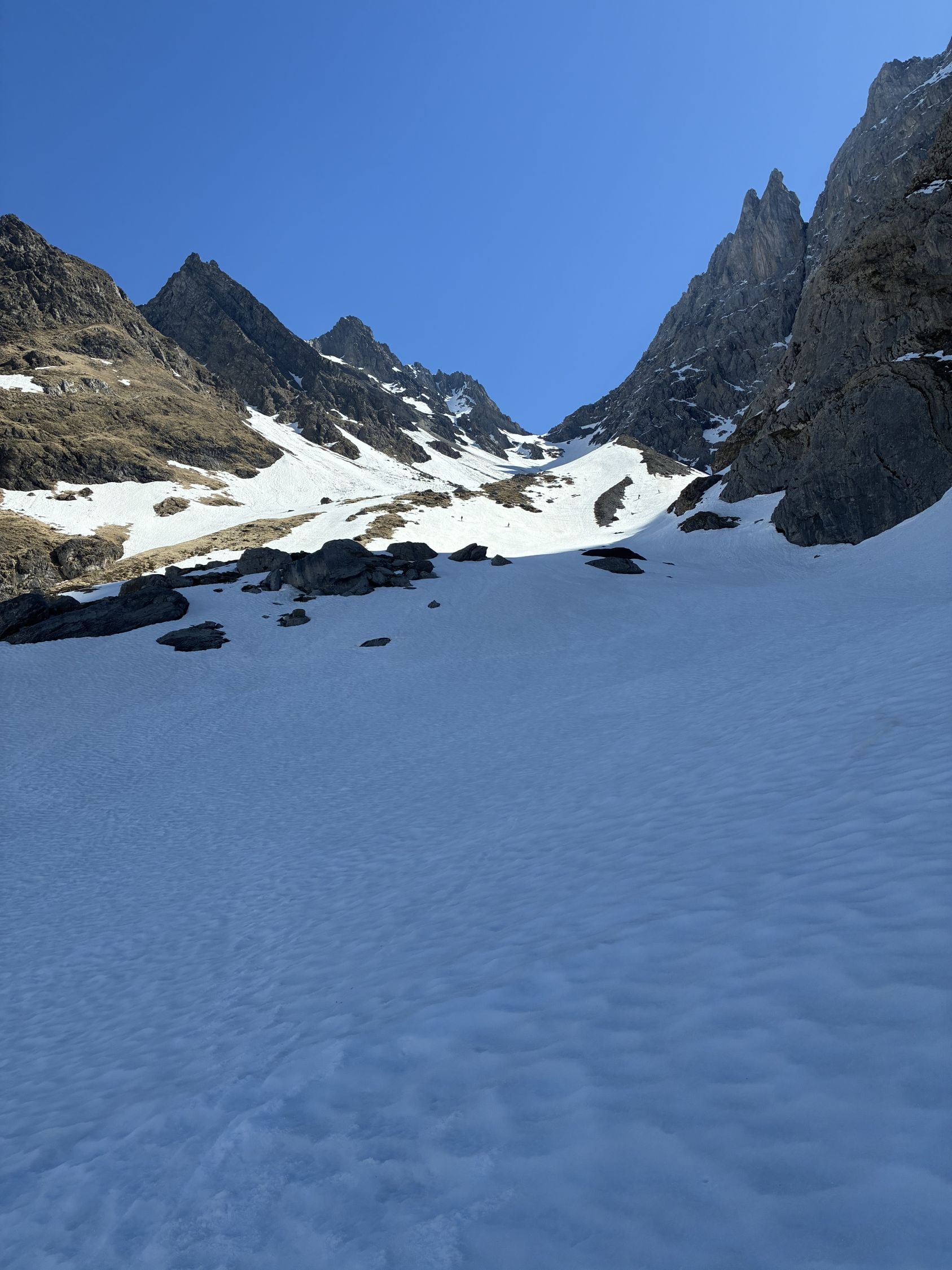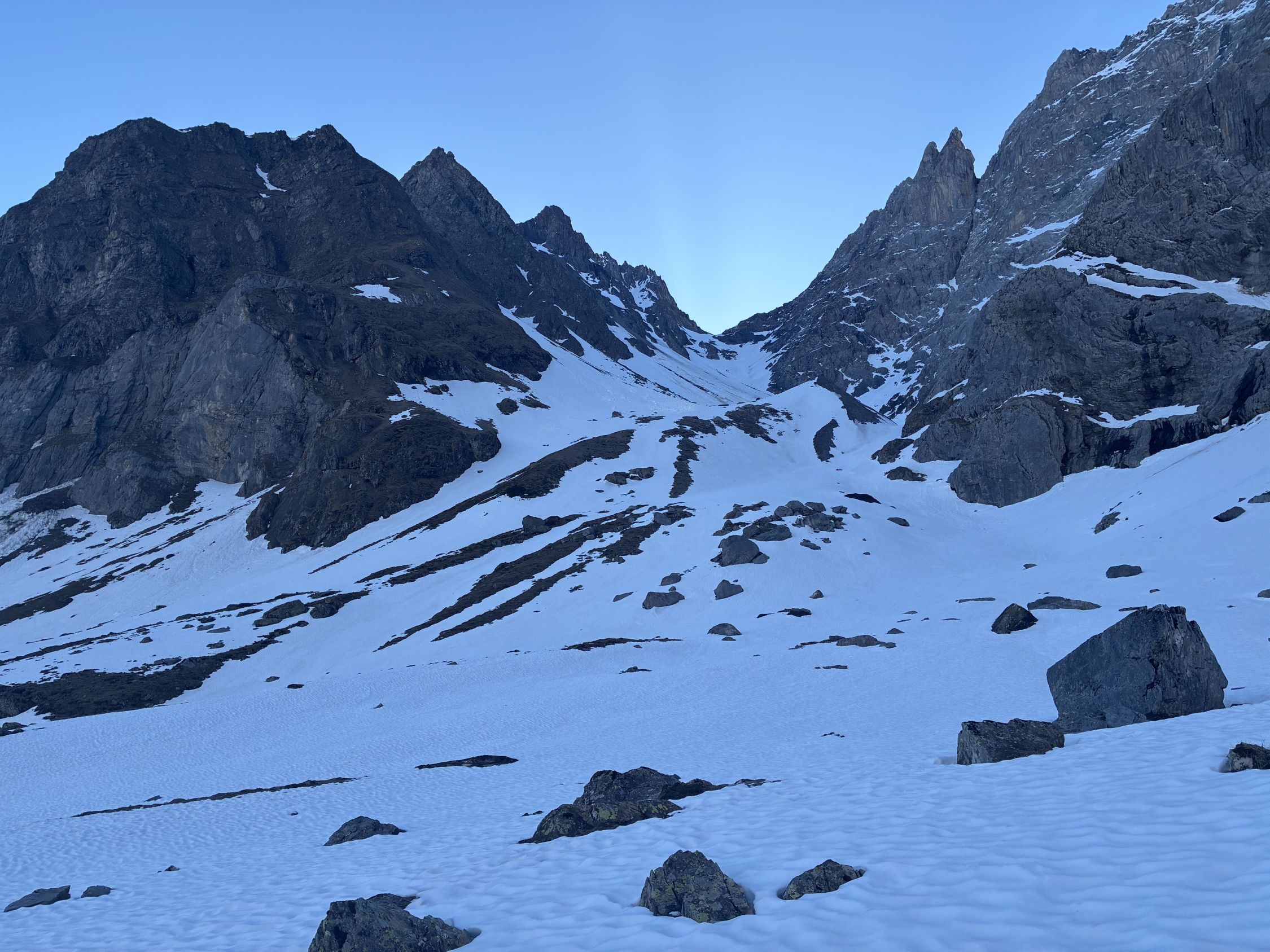Bis zur Chälen alles hart, das steigert sich dann in der Chälen. Machbar mit Harscheisen, recht glatte Oberfläche, Lawinenrunse im oberen Teil kann am linken Rand umgangen werden. Dennoch Eiertanz - wer rutscht, liegt unten.