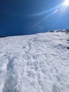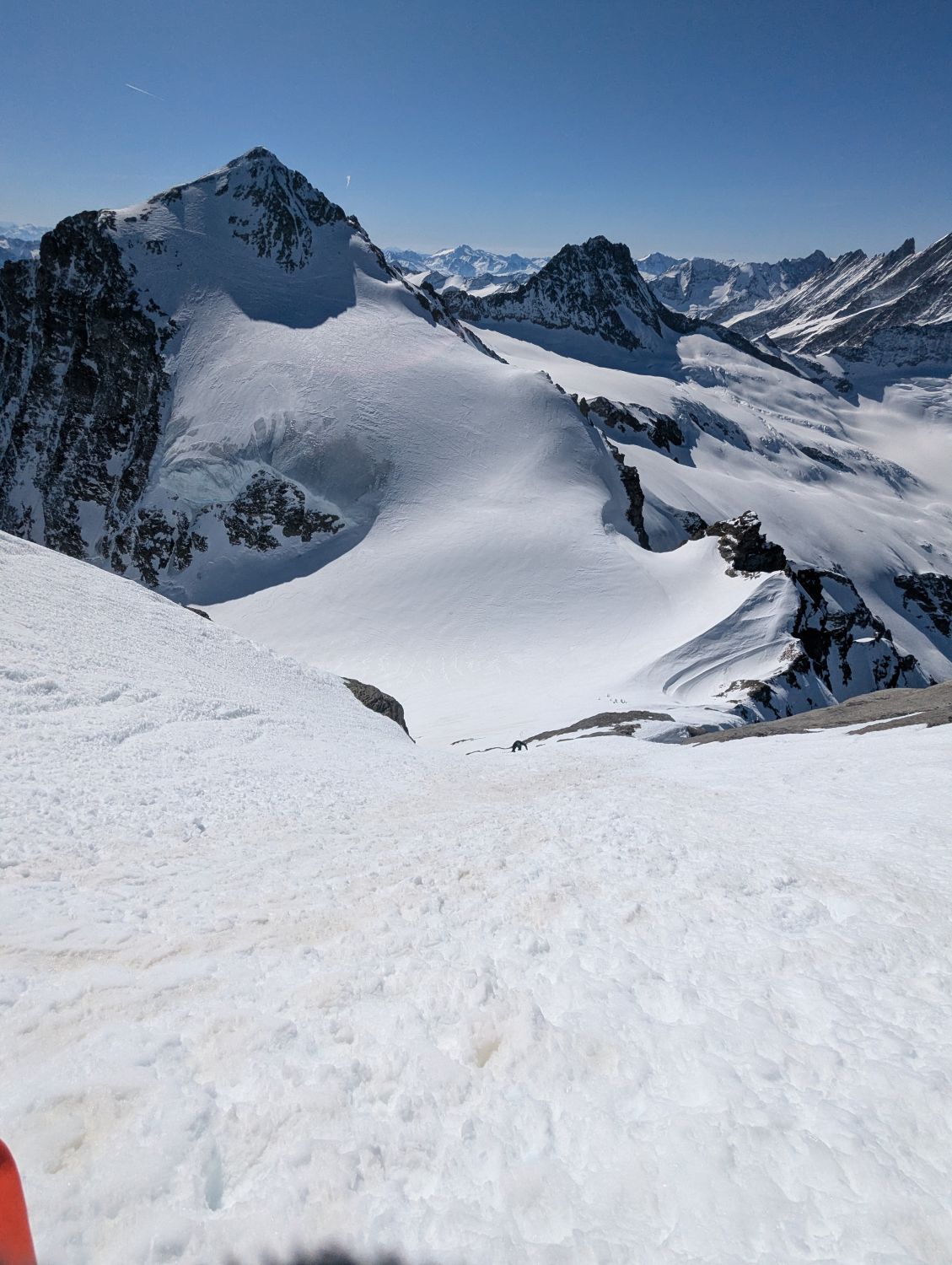 Gesamter Gletscher gut eingeschneit, Aufstieg zum Wetterhorn (40-45 °) mit guter Spur. Danach (andere Reihenfolge als Route Beschreibung) rüber zum Mittelhorn, Aufstieg steil direkt zum Gipfel (könnten 45-50 ° sein). Einzig die drei Solo Türler sind noch (zeitverserzt) zum Mittelhorn. Zur Krönung noch Abfahrt durch die Rinne direkt auf den Rosenlouwiglwtscher, spart den Gegen anstieg von Wellhornsattel.