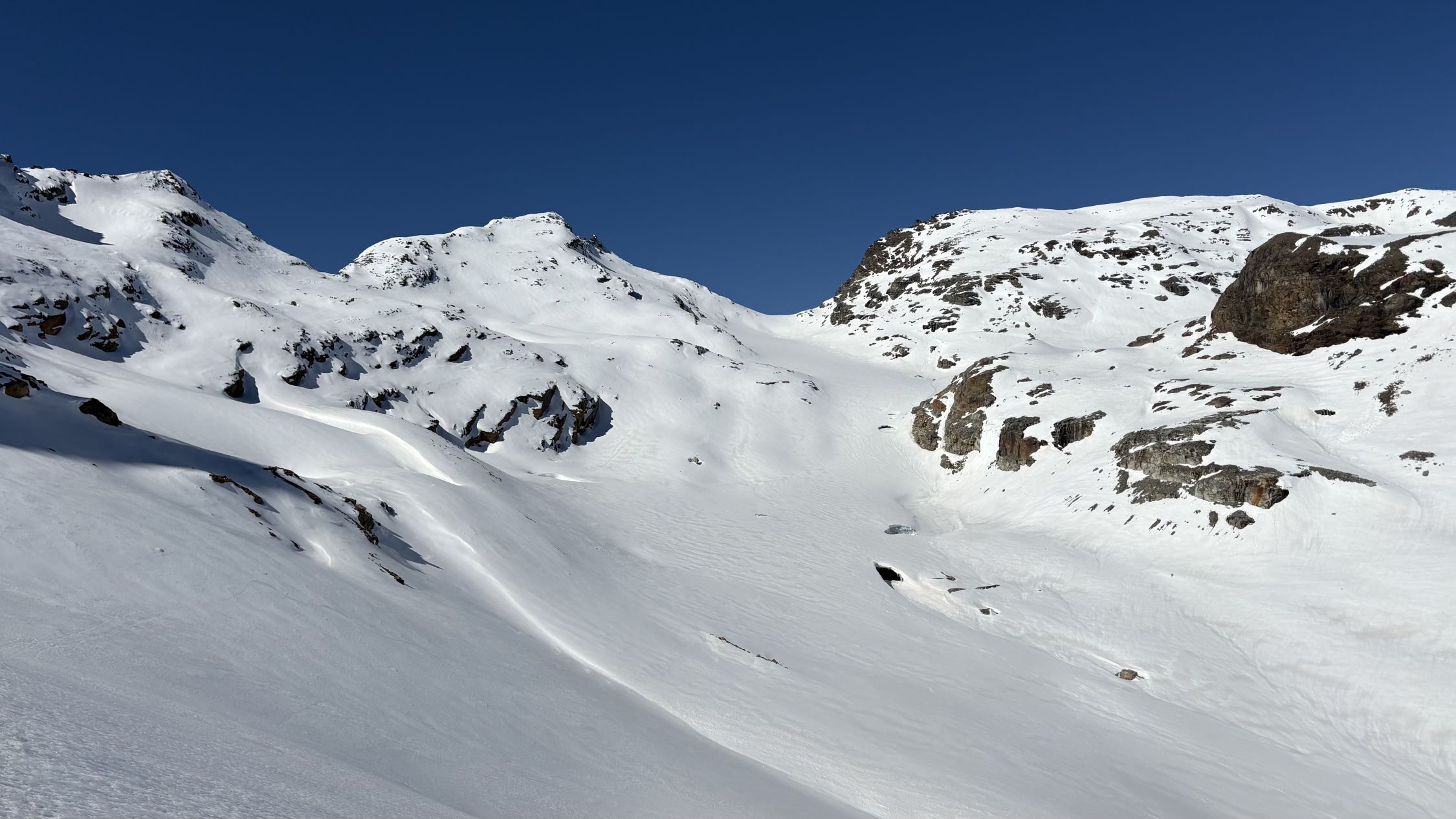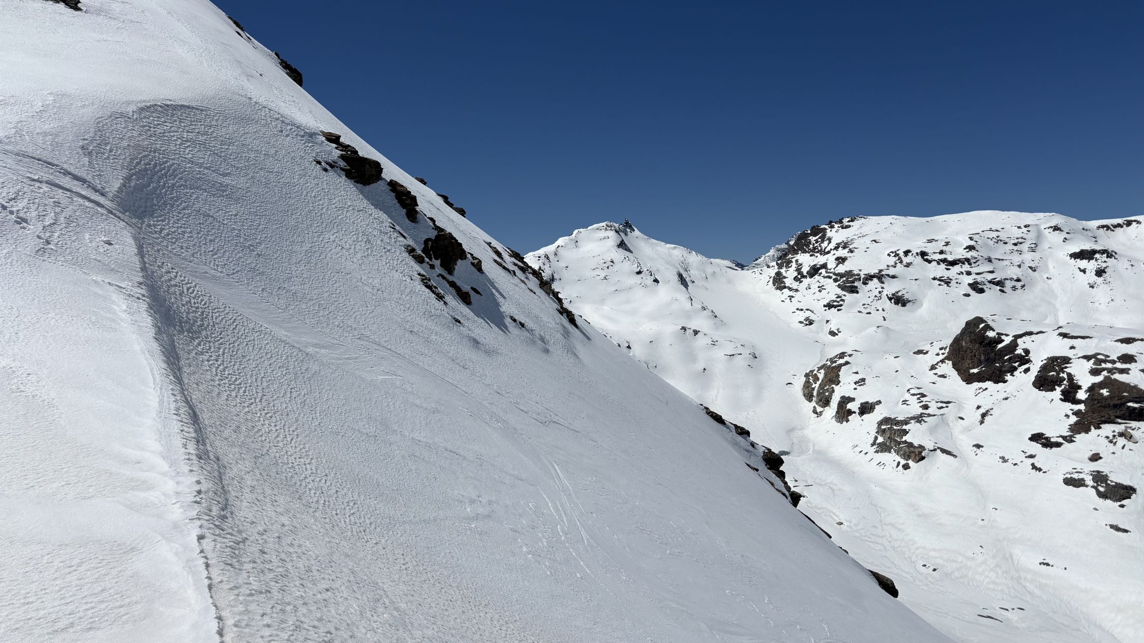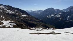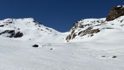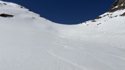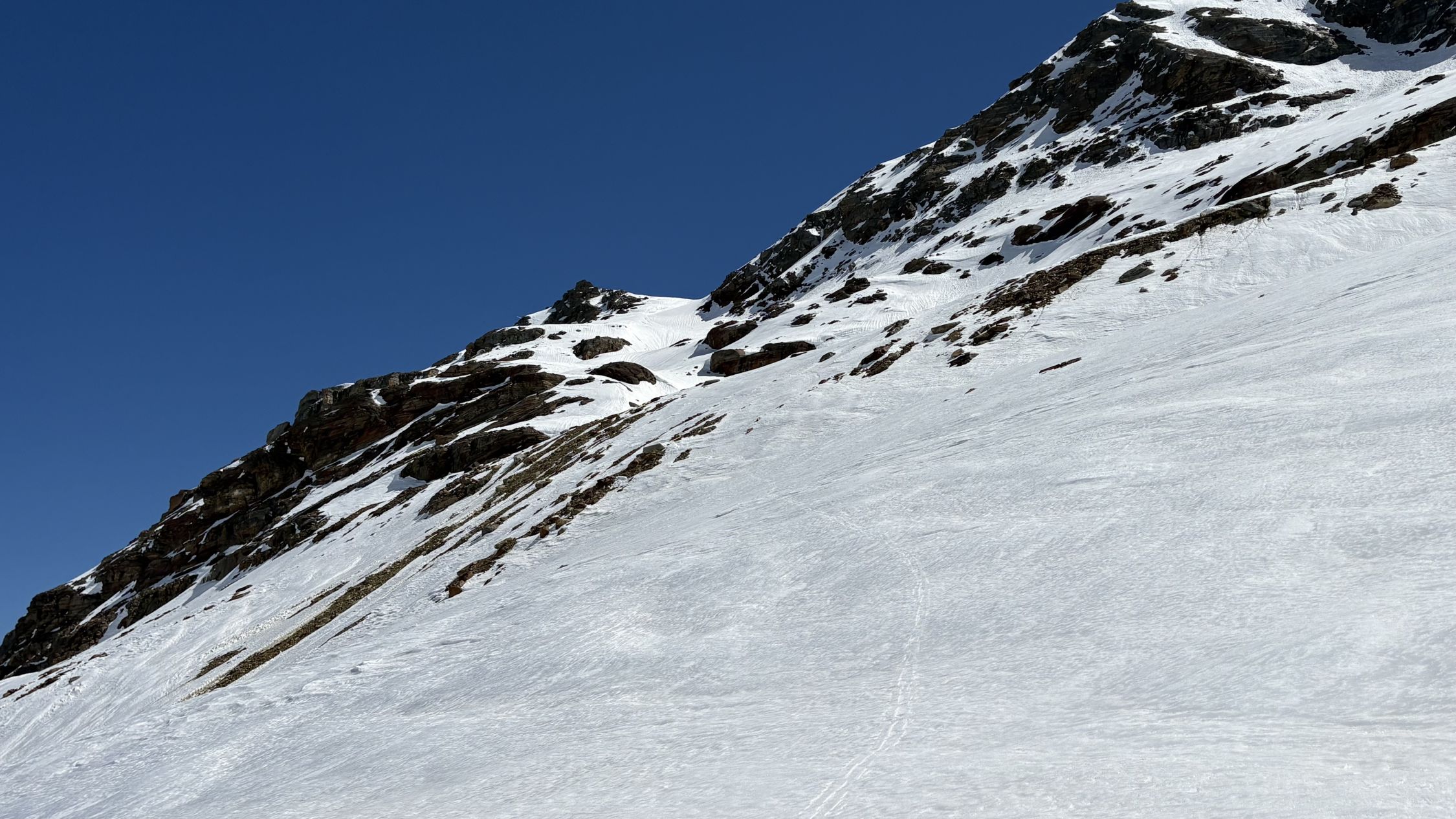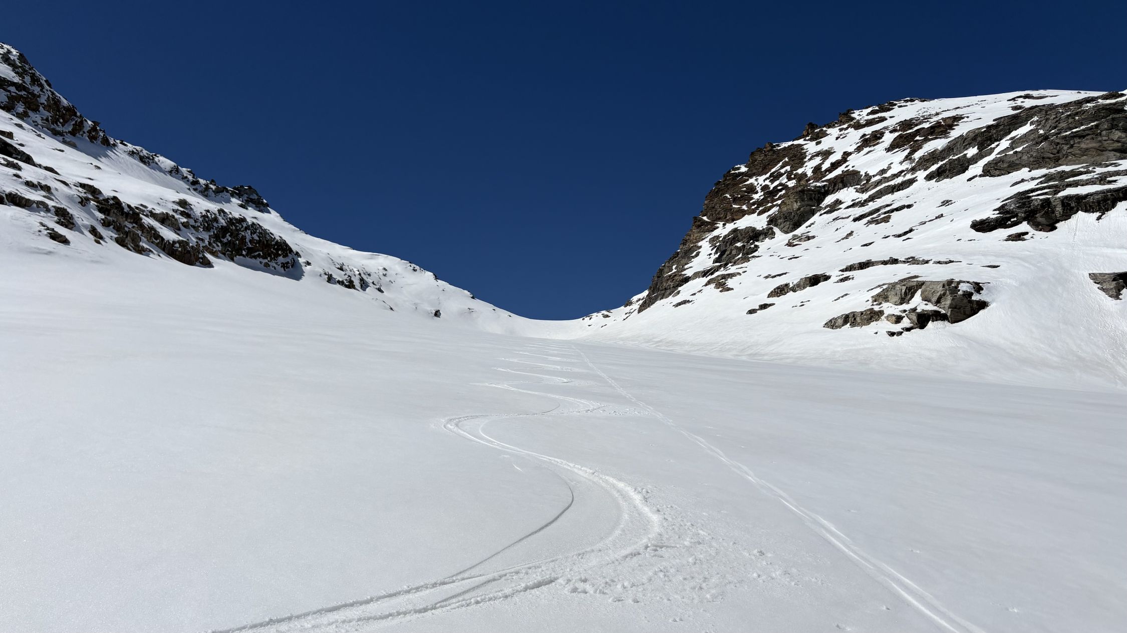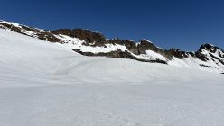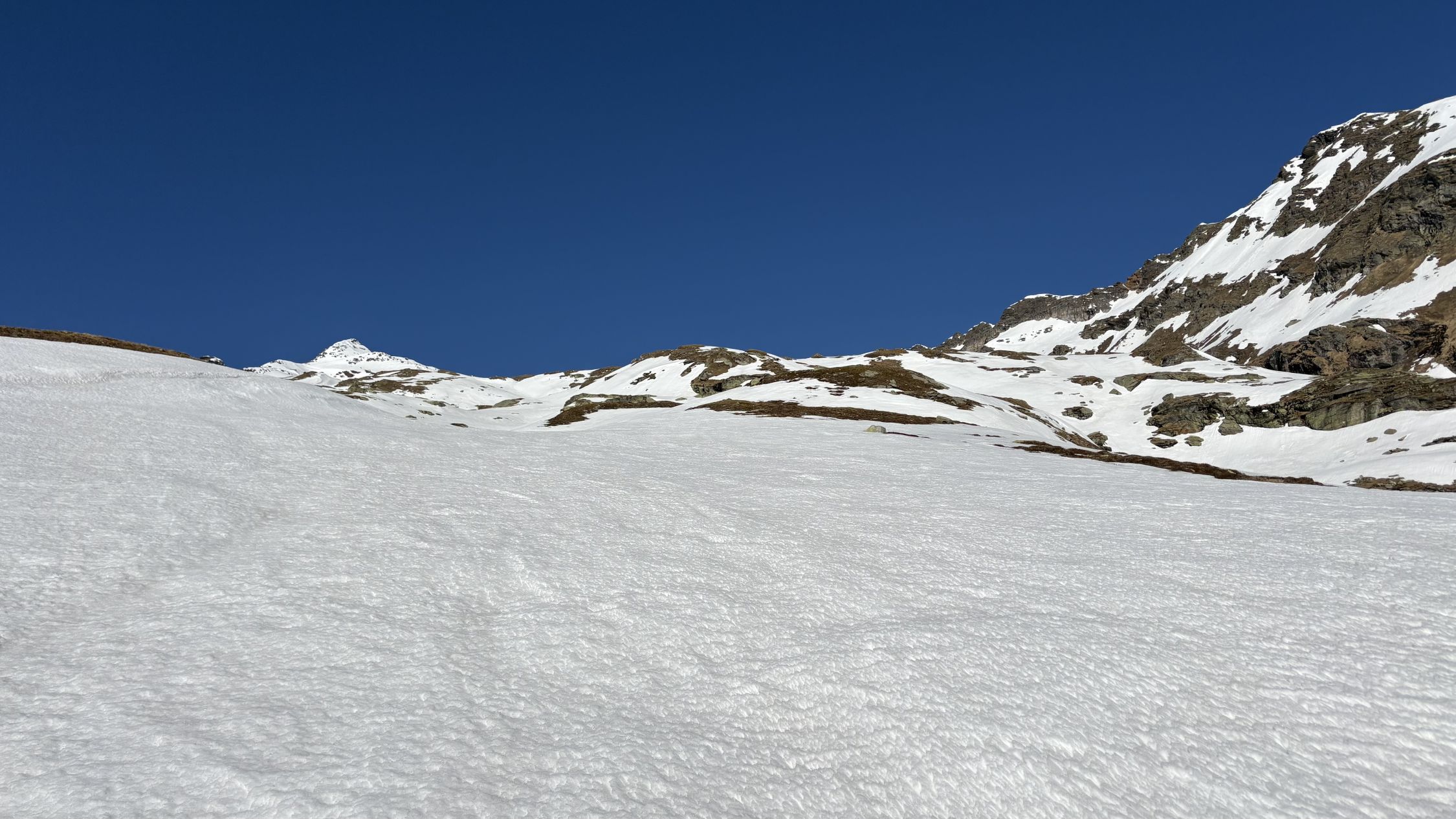 Die Schlussabfahrt konnte nun in vollen Zügen genossen werden. Und tatsächlich, wie gestern, circa 150 Höhenmeter vor der Gletschertaxihaltestelle wechselte der Sulz urplötzlich auf Bremsschnee. Das war jedoch eher positiv, weil ich dadurch besser durch das Fleckenlabyrinth finden konnte, ohne auch nur einen Kratzer zu erleiden.