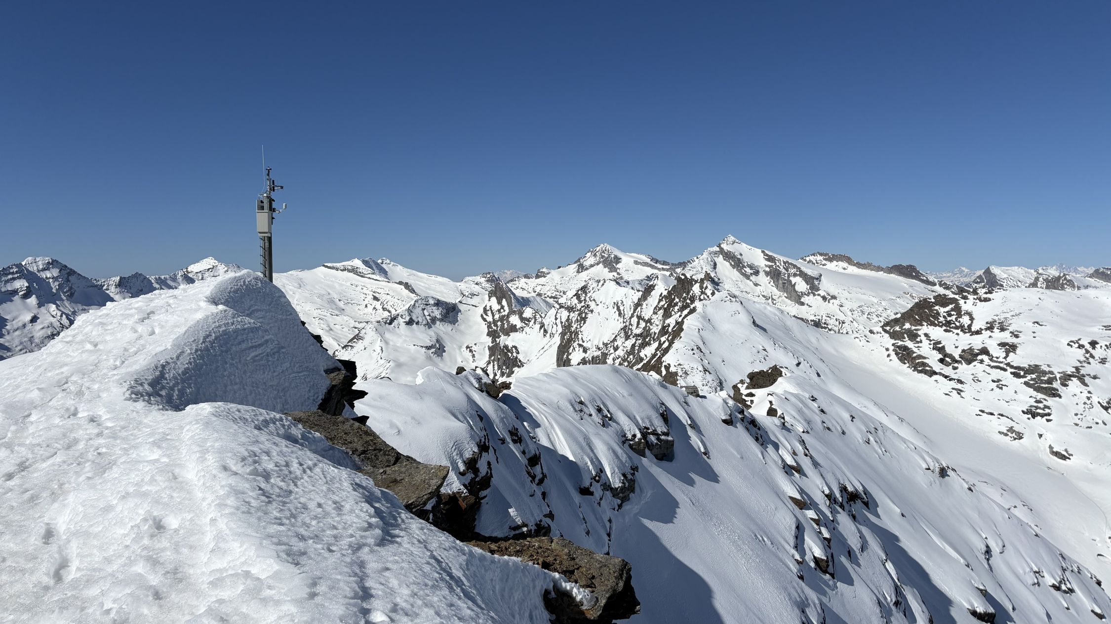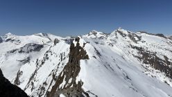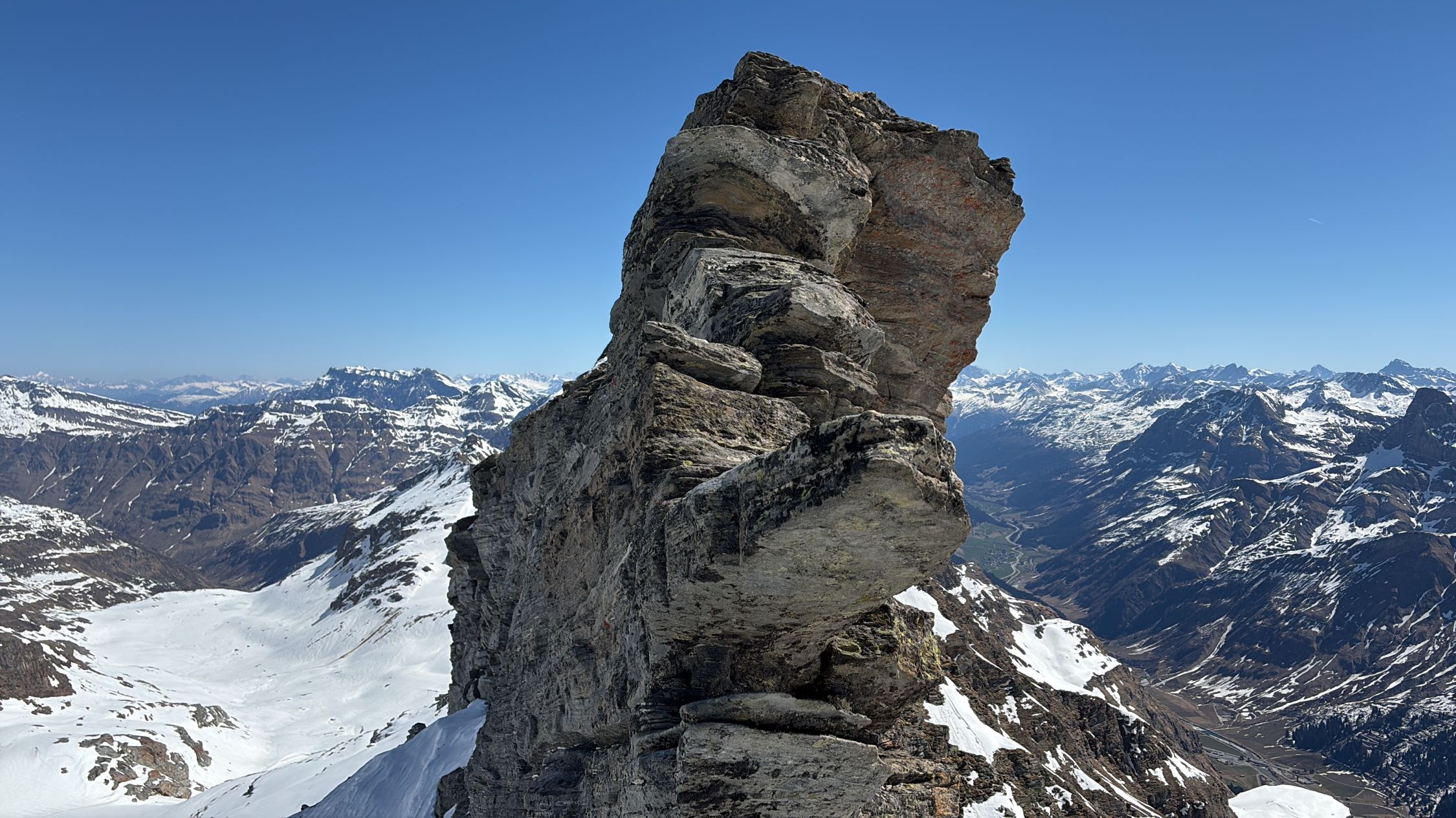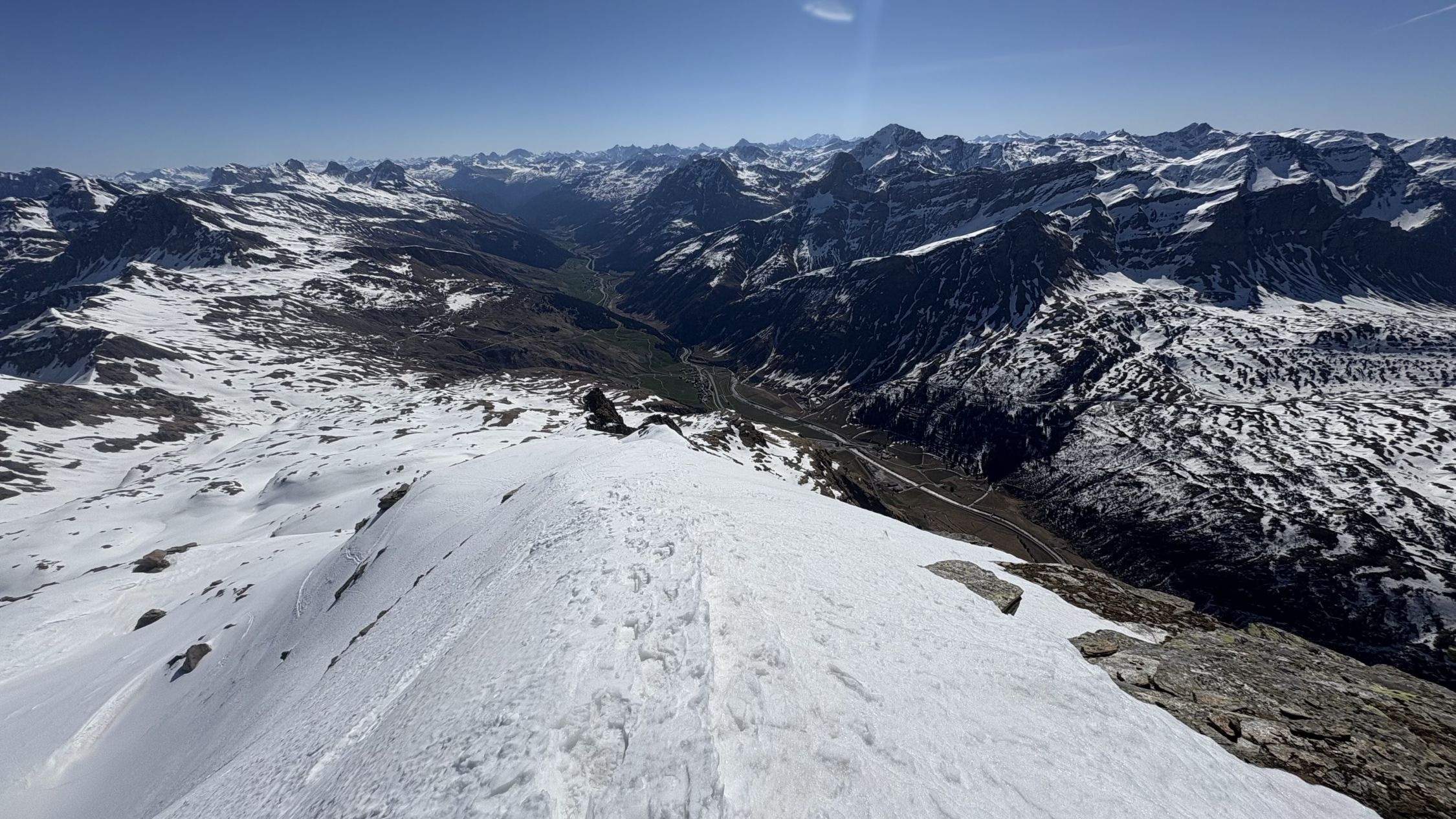 Im Skidepot war‘s wie gestern windstill. Rasch gelangte ich über die paar Blöcke auf den Vorgipfel, bei dem ich es in Anbetracht vergessener Kletterfinken und Balancierstange bleiben liess.