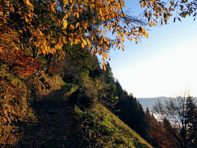 Start um ca.6.45 bei 5°. Die Nebelgrenze befand sich genau bei der Talstation der Seilbahn. Darüber komplett wolkenlos. Im Lauf des Vormittags löste sich der Nebel im Rheintal auf. In der Höhe sehr mild.