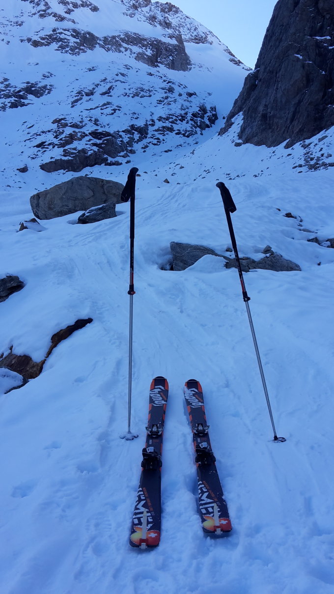Die Abfahrt(ca.14Uhr) war der Hammer. Seidenweich reagierten die Ski auf der festen Unterlage auf jeden "Befehl"von "oben". Das Pulverschümli obendrauf rundete die Sache noch zusätzlich ab. Untenraus ein Mix aus umsichtig(versteckte Steine)fahren und absteigen bis zum PP zurück.