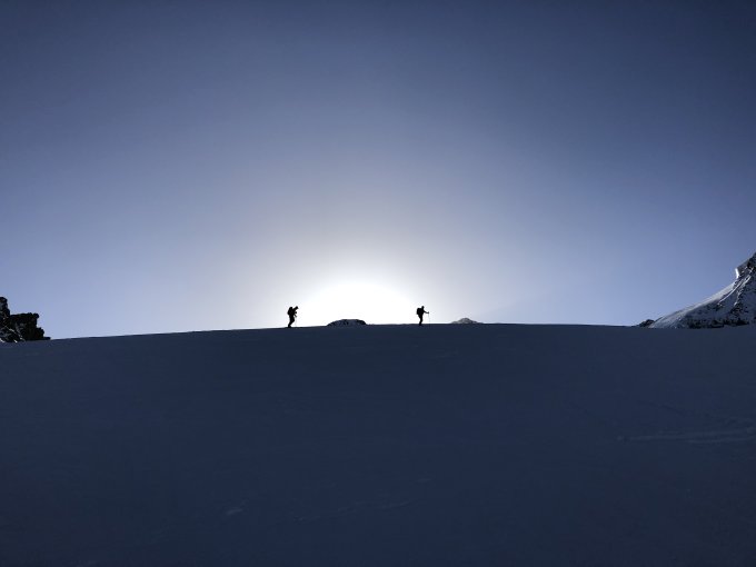 Die Querung vom Col zum Gipfelgletscher ist etwas mühsam. Der steile Fels ist nur spärlich mit Schnee zugedeckt. Die Schicht ist eher dünn und vereist. Harscheisen sind sehr empfehlenswert!