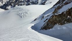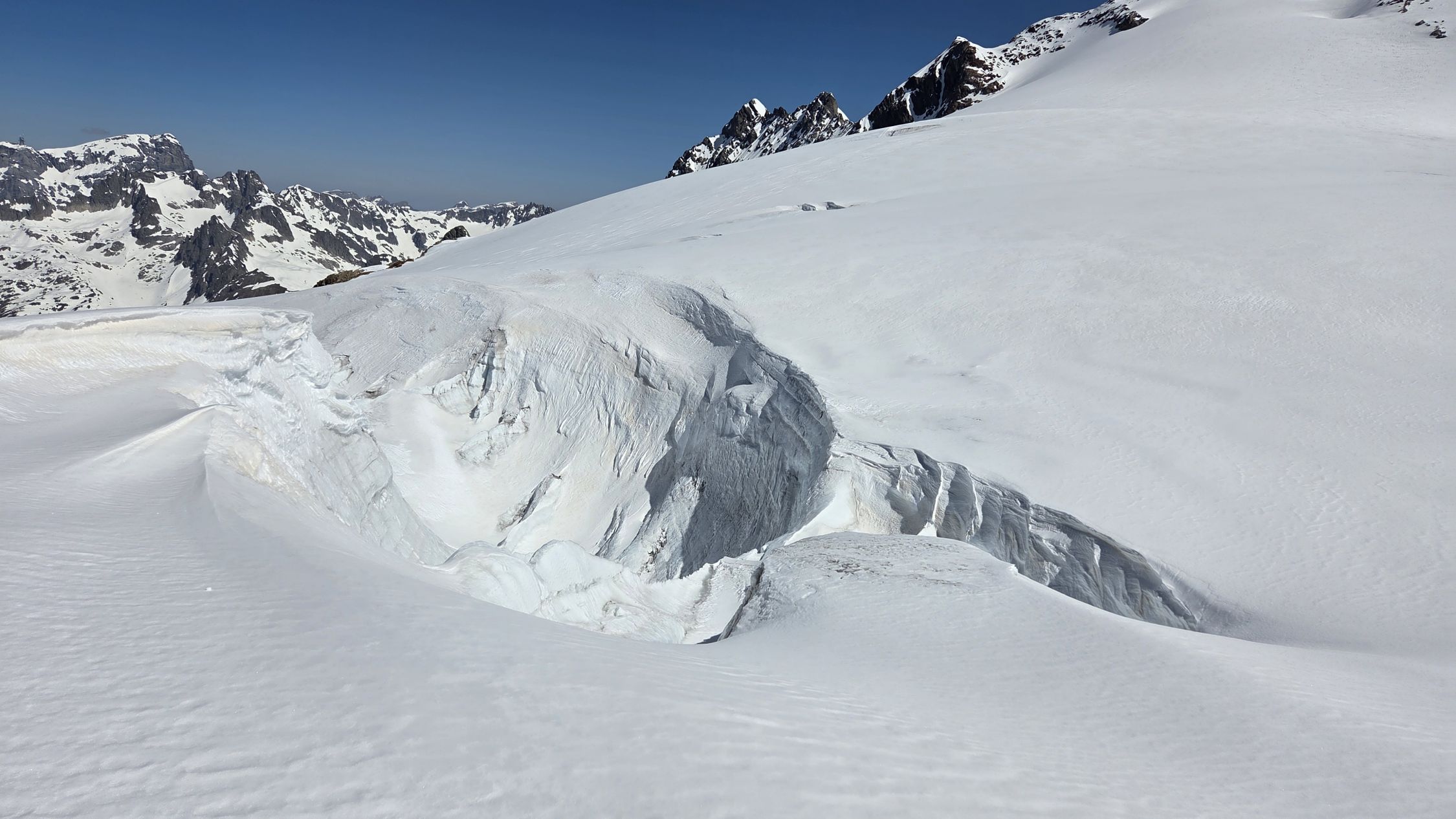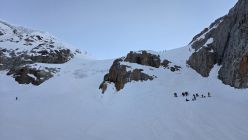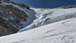 Start bei ca 6° um 6h. Schnee trotzdem perfekt gefroren ab Steingletscher. Harscheisen blieben aber im Rucksack, denn die raue Schneedecke ausserhalb der ausgetretenen, glasigen Spuren bietet genügend halt. Steilstelle geht problemlos zu Fuss auf der in Aufstiegsrichtung rechten Seite, je nach Präferenz mit oder ohne Steigeisen. Die linke Seite sah tw. blank aus, liess sich aber offensichtlich mit Skis abfahren.