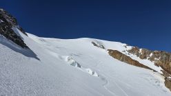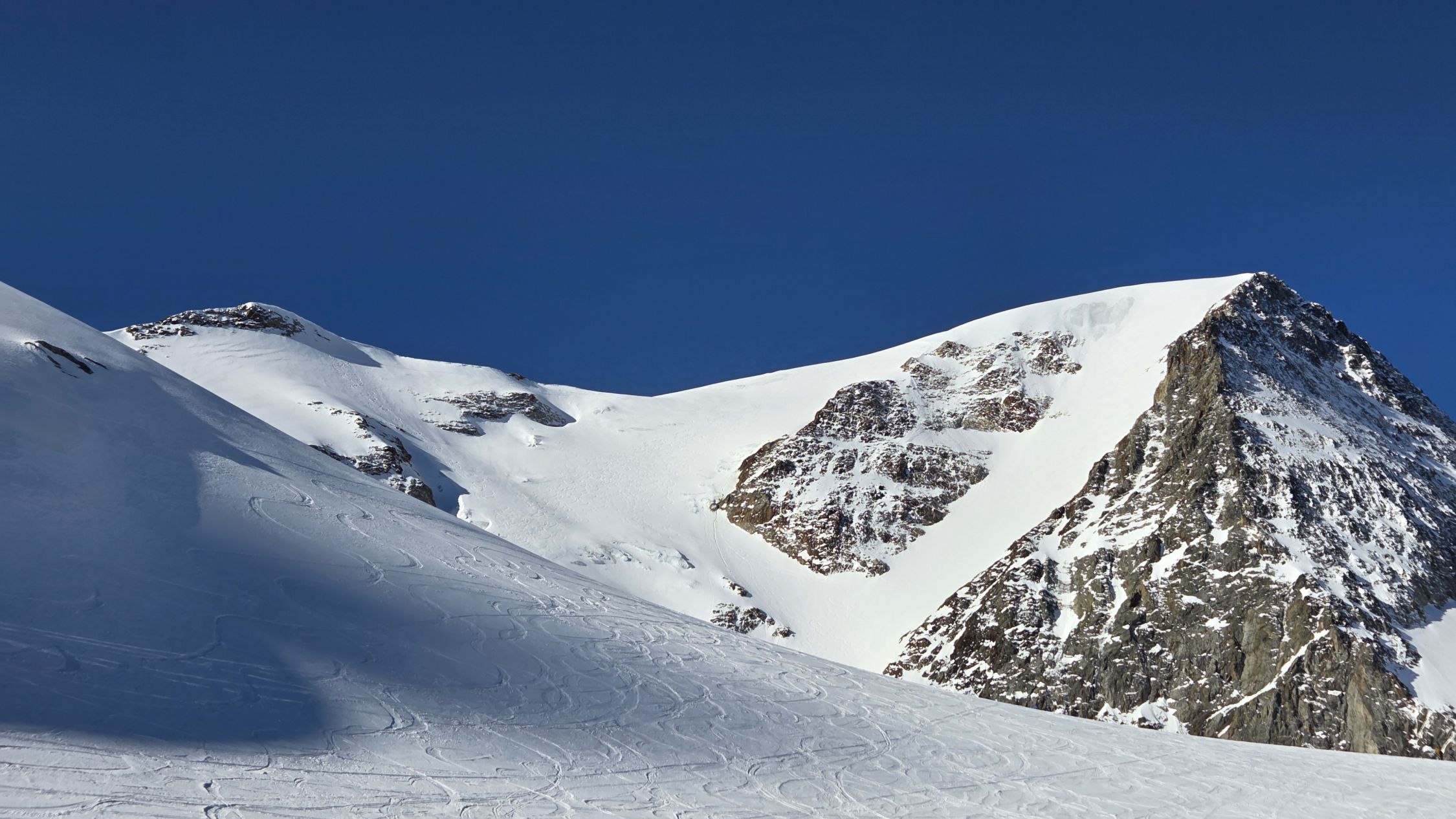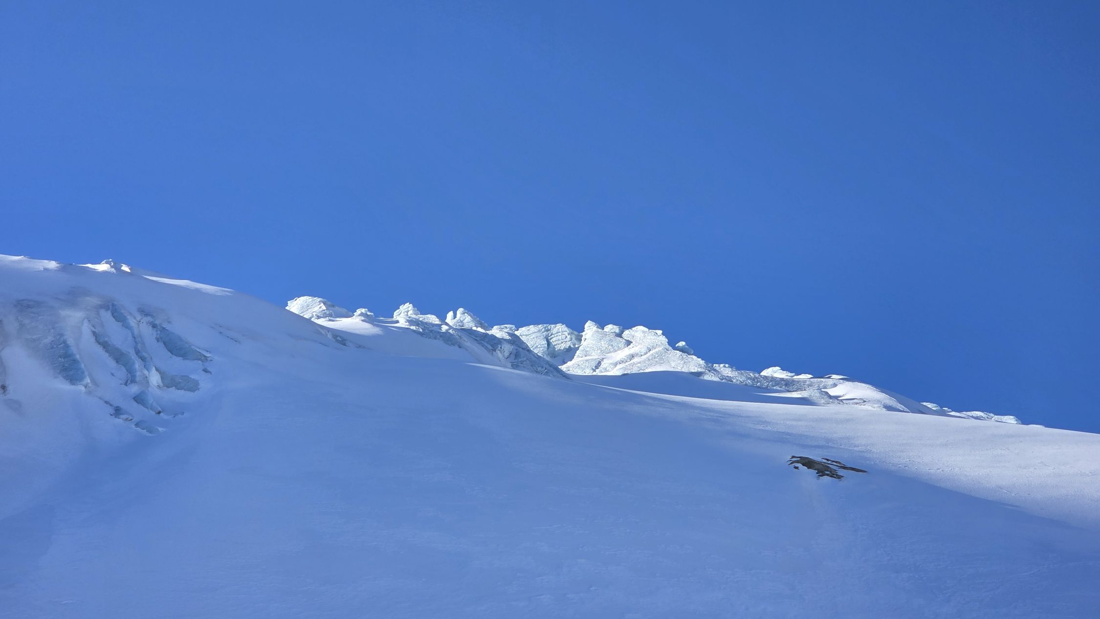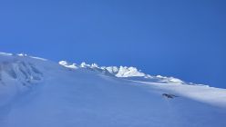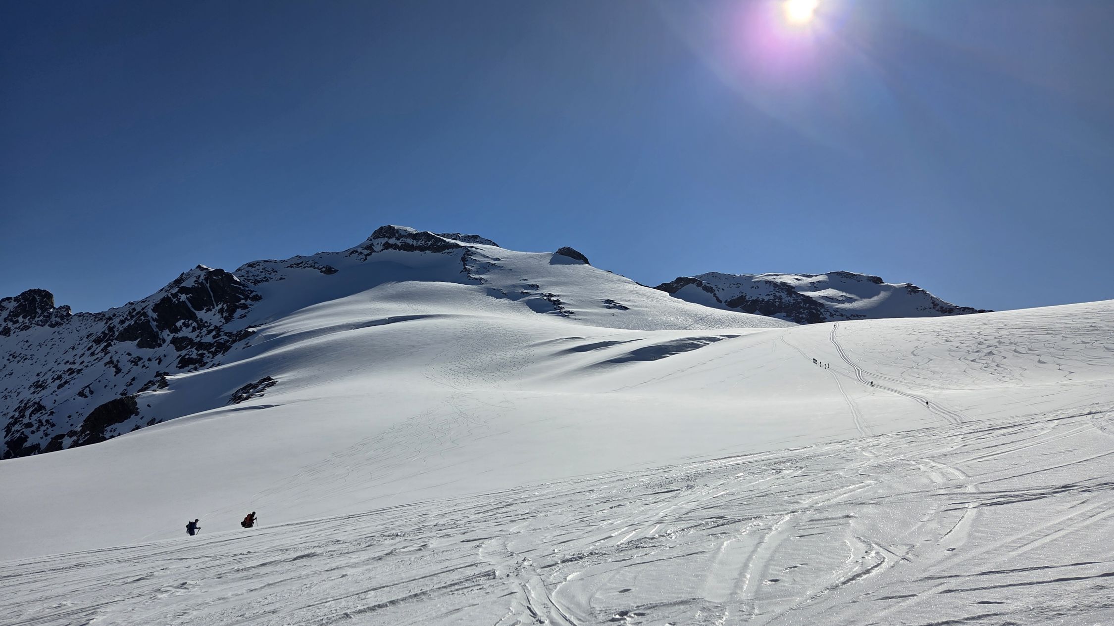 Weiterer Aufstieg problemlos, recht warm und windstill bis zum Gipfel. Wir sind die Nordflanke abgefahren. Ging gut im Presspulver, könnte aber auch schöner sein in leichterem Pulver. Die steile Ostflanke wurde auch gefahren und soll gemäss Aussage gute Bedingungen aufweisen.