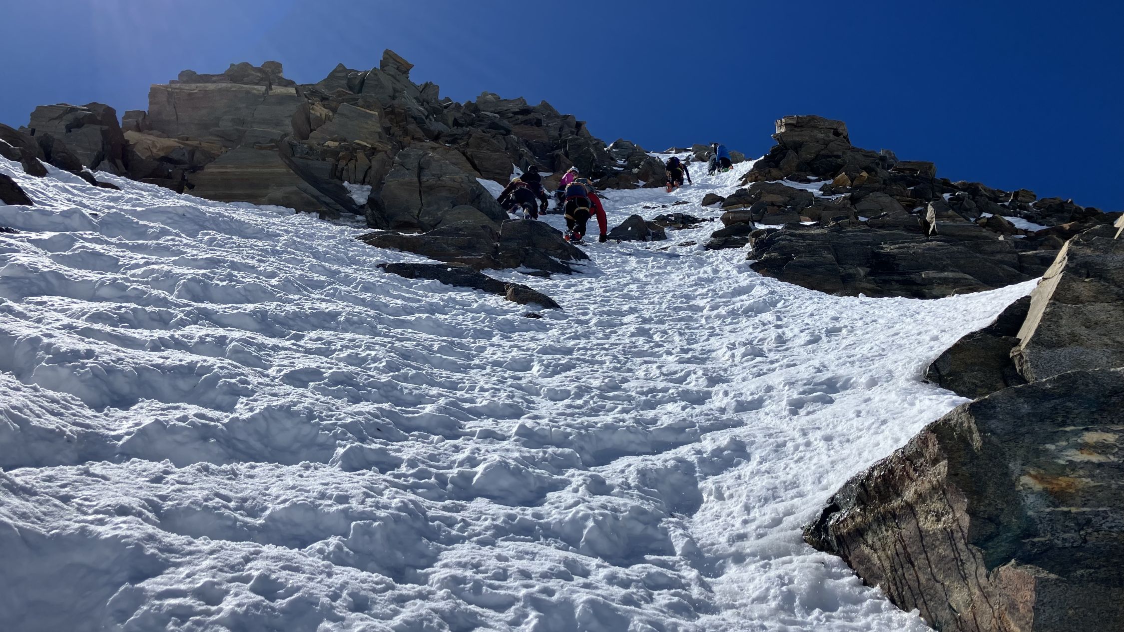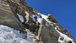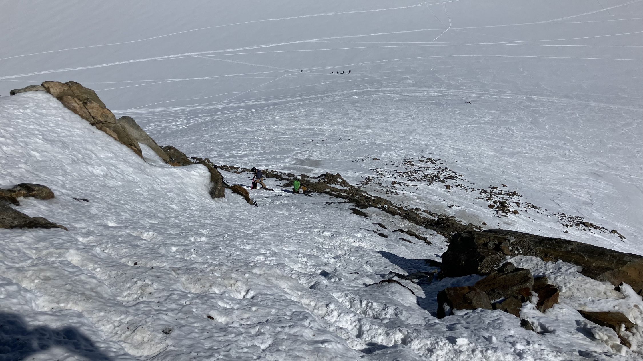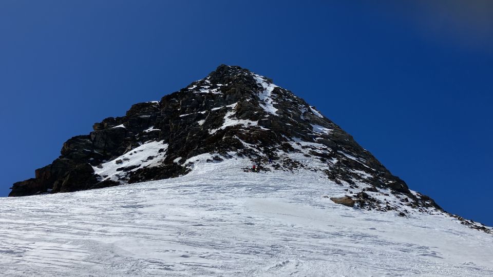 Gletscher ist noch gut eingeschneit, keine Spalten sichtbar. Morgens waren bei der kurzen Steilstufe zum Pfaffenferner Harscheisen nötig. Gipfelaufstieg unterste Meter schon etwas eisig. Oben guter Trittschnee. Könnte mir vorstellen, dass es mit etwas mehr Schnee noch leichter wäre, daher nur ein gut. Fixseil (falls es das noch gibt) unter Schnee.