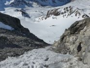 Auf dem Hüttenweg ab ca. 2400 m mit Unterbrüchen noch Schnee. Ansonsten schon knapp unterhalb der Pizzinihütte keine geschlossene Schneedecke mehr. Die Rinne, die zum Kamm führt, ist auf den untersten rund 50 m bereits stark ausgeapert, ebenso ein paar Meter im Ausstieg. Ging aber auf Eis und Restschnee gerade noch gut (zu Fuss mit Steigeisen). Feste gefrorene, aber nicht eisige, Schneedecke oder guter Trittschnee, so dass man auf den Wechsel Steigeisen - Ski - Steigeisen (Gipfelaufstieg, ab üblichem Skidepot ca. 100 m unterhalb) gut verzichten konnte. In der Abfahrt Gipfelflanke stark zerfahren und ruppig, aber ansonsten gut. Ab Ende der Rinne (ca. 3350 m) bis zur Hütte sehr schöne Sulzschneeabfahrt.