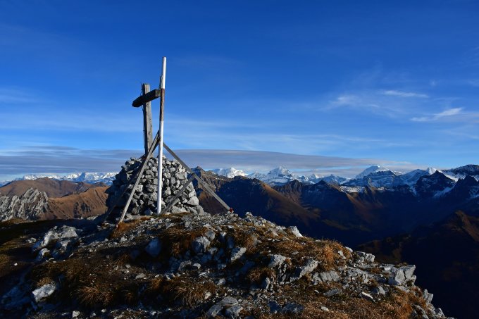 Am Gipfel, ja auf der ganzen Route kein Mensch gesehen. Ich war allerdings erst um die Mittagstunde aufgebrochen. Eine herrliche Ambiance und trotz den hohen Wolken, die die Sicht auf den meisten hohen Berner blockierte, war das Panorama vom Gipfel trotzdem schön.