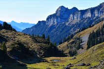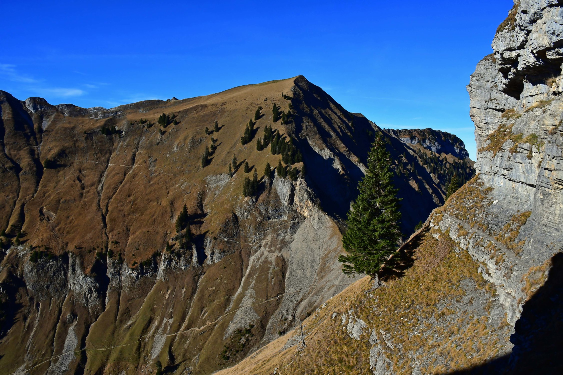 Eigentlich war nur die Besteigung des Schibe vorgesehen. Beim Studieren der Karte entdeckte ich dann das Weglein (offenbar vom Militär angelegt), das unter der steilen Westwand des Schibe läuft. Der Einstieg ist leicht zu finden, denn sie befindet sich in einer deutlichen Scharte des Schibe Südgrates. Also mal schauen. Das Gelände ist sehr steil und der ersten Abstieg war etwas glitschig. Nachher führt das Weglein horizontal durch die Wand und ist sehr schmal. Hier ist Trittsicherheit einen Muss! Am Ende leicht hinauf und an einer Militär-Schiessloch vorbei und dann runter zur Sichle.