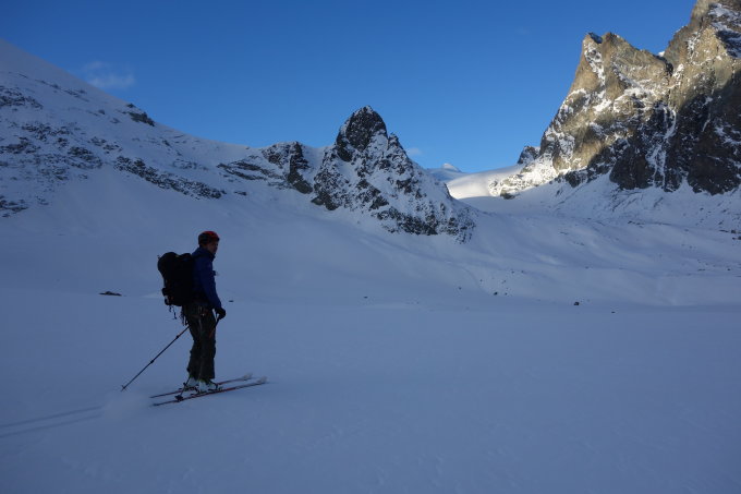 Start um 8:00 vom Refuge des Bouqetins. Zuerst Abfahrt auf den Glacier de Arolla, man fährt auf dünner Pulverauflage auf Hartschnee, schön für ein paar Schwünge.